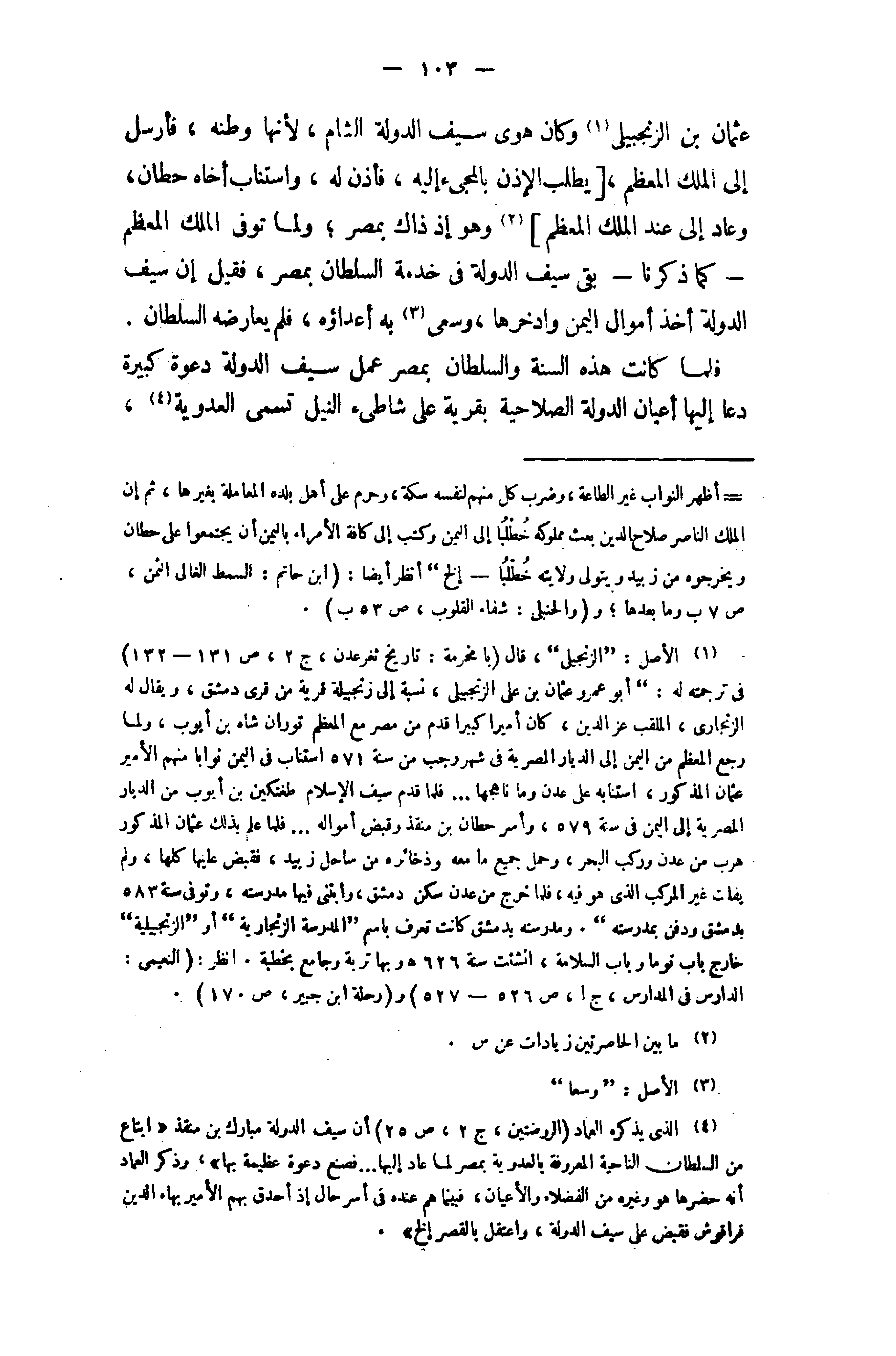 (¬1) الأصل: " الزنجيلى "، قال (بامخرمة: تاريخ ثغر عدن، ج 2، ص 131 - 132) في ترجمته له: " أبو عمرو عثمان بن على الزنجبيلى، نسبة إلى زنجبيلة قرية من قرى دمشق، ويقال له الزنجارى، الملقب عز الدين، كان أميرا كبيرا قدم من مصر مع المعظم توران شاه بن أيوب، ولما رجع المعظم من اليمن إلى الديار المصرية في شهر رجب من سنة 571 استناب في اليمن نوابا منهم الأمير عثمان المذكور، استنابه على عدن وما ناهجها. . . فلما قدم سيف الإسلام طغتكين بن أيوب من الديار المصرية إلى اليمن في سنة 579، وأسر حطان بن منقذ وقبض أمواله. . . فلما علم بذلك عثمان المذكور هرب من عدن وركب البحر، وحمل جميع ما معه وذخائره من ساحل زبيد، فقبض عليها كلها، ولم يفلت غير المركب الذى هو فيه، فلما خرج من عدن سكن دمشق، وابتنى فيها مدرسته، وتوفى سنة 583 بدمشق ودفن بمدرسته ". ومدرسته بدمشق كانت تعرف باسم " المدرسة الزنجارية " أو " الزنجبيلية " خارج باب توما وباب السلامة، انشئت سنة 626 هـ وبها تربة وجامع بخطبة. انظر: (النعيمى: الدارس في المدارس، ج 1، ص 526 - 527) و (رحلة ابن جبير، ص 170).