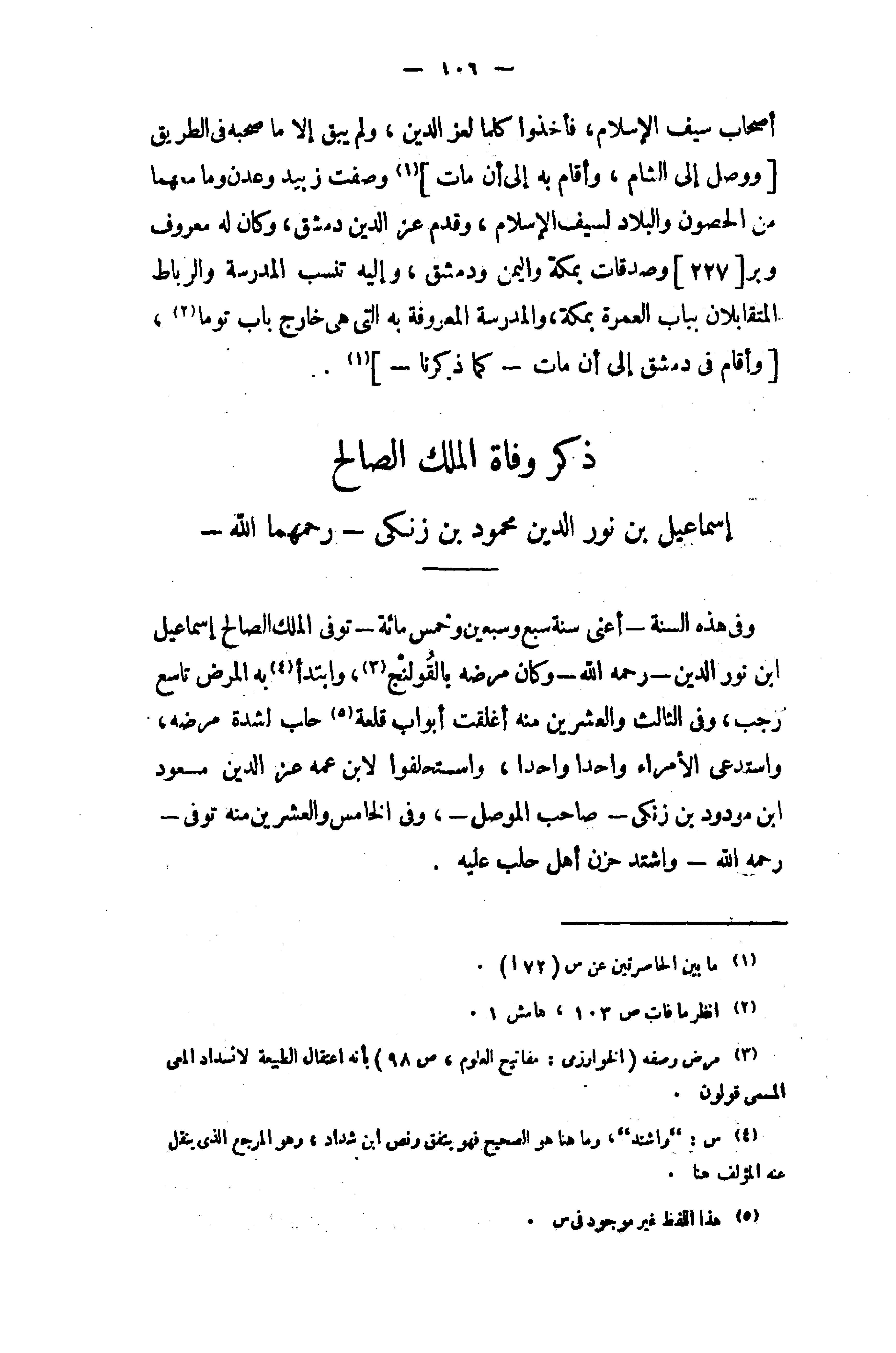 وفى هذه السنة - أعنى سنة سبع وسبعين وخمس مائة - توفى الملك الصالح إسماعيل ابن نور الدين - رحمه الله - وكان مرضه بالقولنج (¬3)، وابتدأ (¬4) به المرض تاسع رجب، وفى الثالث والعشرين منه أغلقت أبواب قلعة (¬5) حلب لشدة مرضه، واستدعى الأمراء واحدا واحدا، واستحلفوا لابن عمه عز الدين مسعود ابن مودود بن زنكى - صاحب الموصل -، وفى الخامس والعشرين منه توفى - رحمه الله - واشتد حزن أهل حلب عليه.