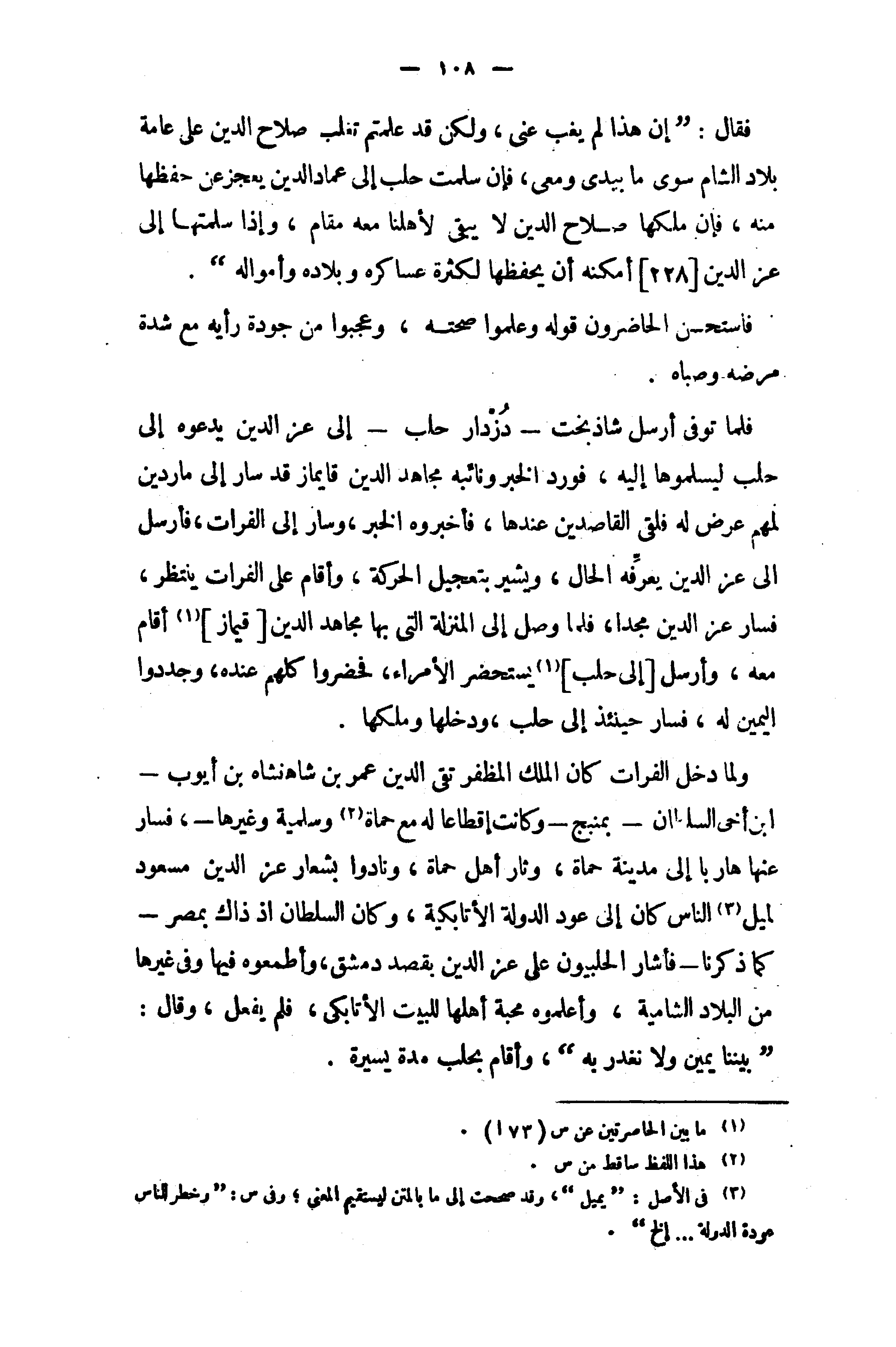 فقال: " إن هذا لم يغب عنى، ولكن قد علمتم تغلب صلاح الدين على عامة بلاد الشام سوى ما بيدى ومعى، فإن سلمت حلب إلى عماد الدين يعجز عن حفظها منه، فإن ملكها صلاح الدين لا يبقى لأهلنا معه مقام، وإذا سلمتها إلى عز الدين [228] أمكنه أن يحفظها لكثرة عساكره وبلاده وأمواله ".