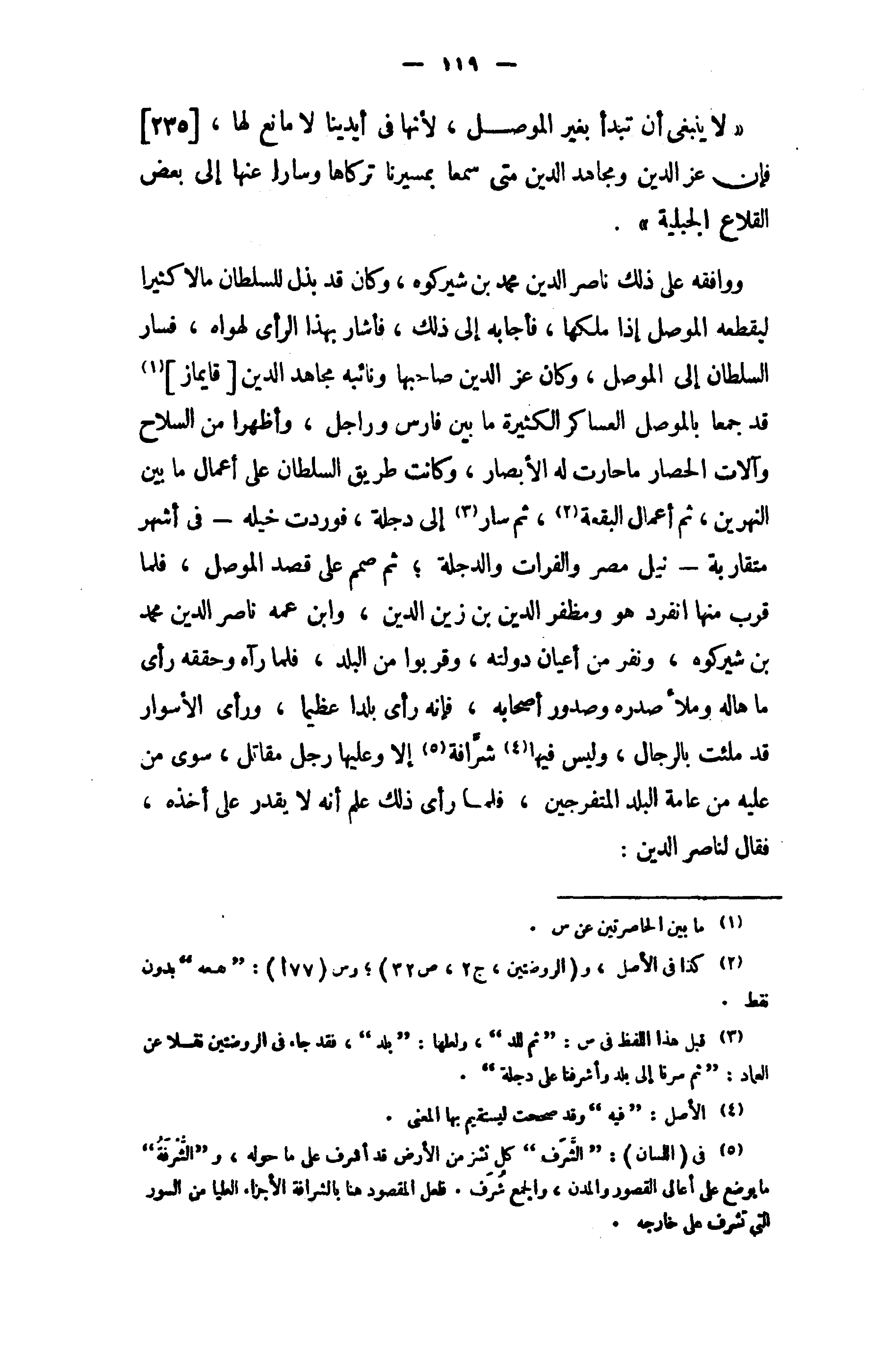 «لا ينبغى أن تبدأ بغير الموصل، لأنها في أيدينا لا مانع لها، [235] فإن عز الدين ومجاهد الدين متى سمعا بمسيرنا تركاها وسارا عنها إلى بعض القلاع الجبلية».