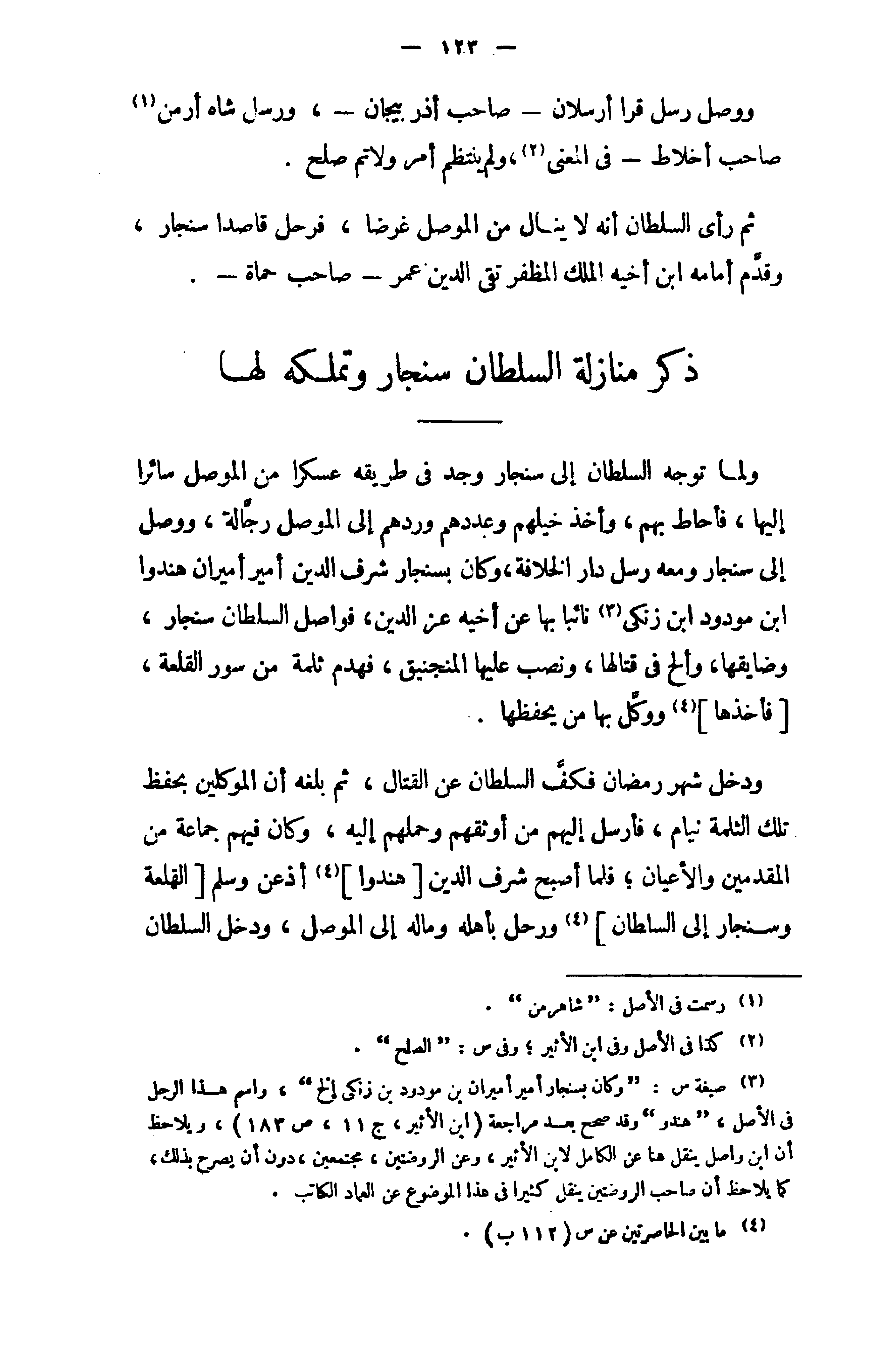 (¬3) صيغة س: " وكان بسنجار أمير أميران بن مودود بن زنكى إلخ "، واسم هذا الرجل في الأصل، " هندو " وقد صحح بعد مراجعة (ابن الأثير، ج 11، ص 183)، ويلاحظ أن ابن واصل ينقل هنا عن الكامل لابن الأثير، وعن الروضتين، مجتمعين، دون أن يصرح بذلك، كما يلاحظ أن صاحب الروضتين ينقل كثيرا في هذا الموضوع عن العماد الكاتب.