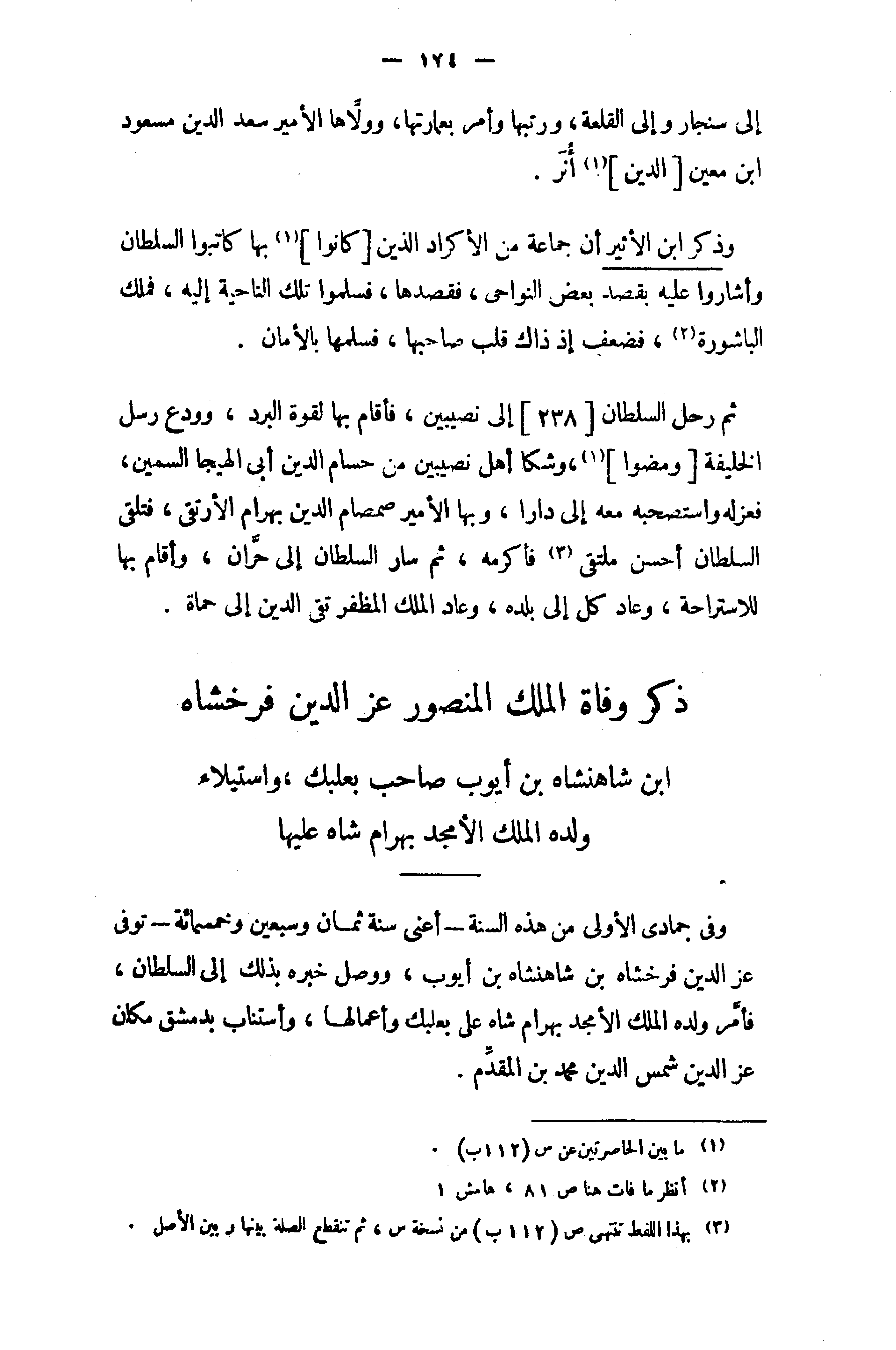 ثم رحل السلطان [238] إلى نصيبين، فأقام بها لقوة البرد، وودع رسل الخليفة [ومضوا] (1)، وشكا أهل نصيبين من حسام الدين أبى الهيجا السمين، فعزله واستصحبه معه إلى دارا، وبها الأمير صمصام الدين بهرام الأرتقى، فتلقى السلطان أحسن ملتقى (¬3) فأكرمه، ثم سار السلطان إلى حرّان، وأقام بها للاستراحة، وعاد كل إلى بلده، وعاد الملك المظفر تقى الدين إلى حماة.