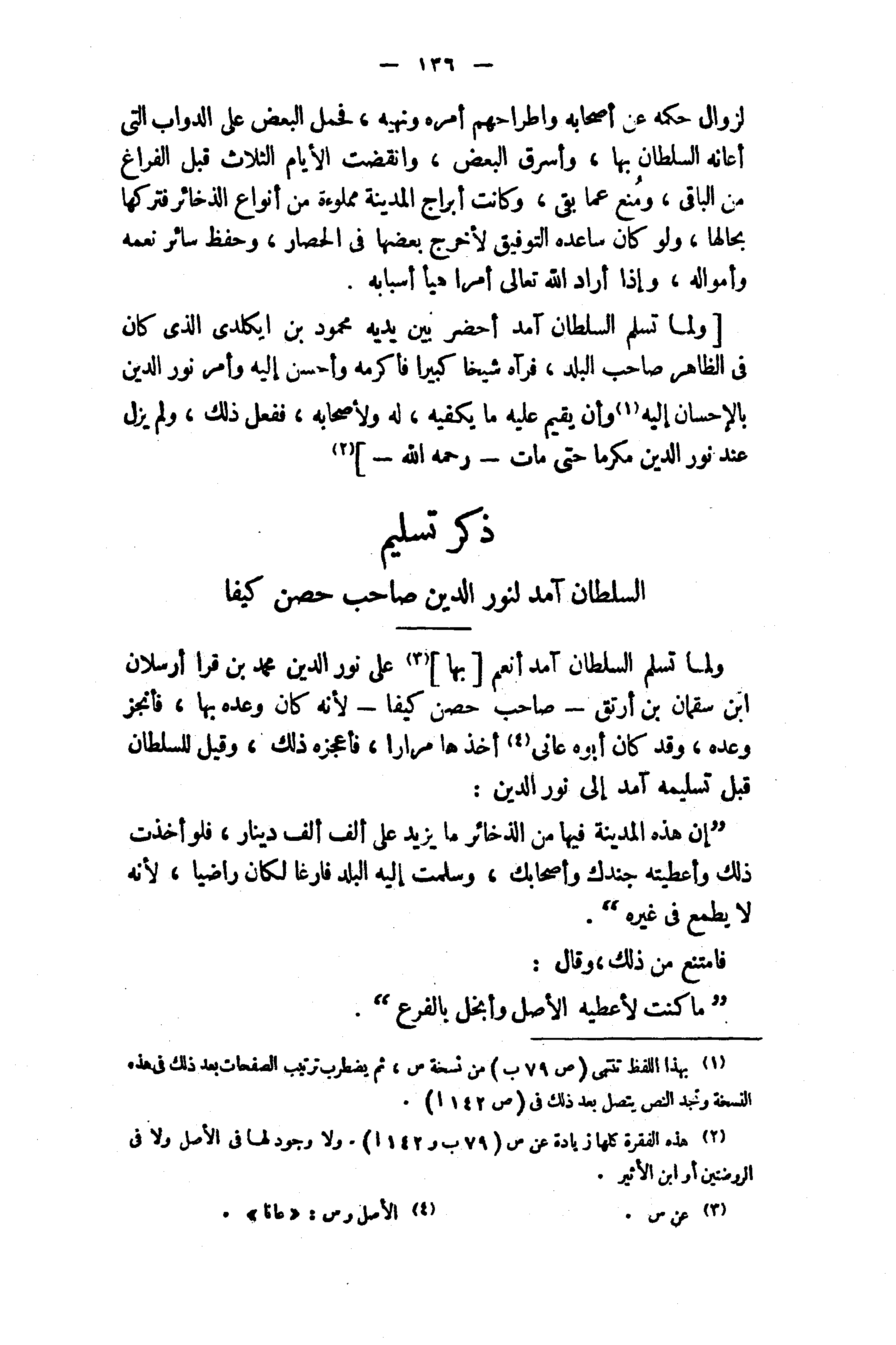 ولما تسلم السلطان آمد أنعم [بها] (¬3) على نور الدين محمد بن قرا أرسلان ابن سقمان بن أرتق - صاحب حصن كيفا - لأنه كان وعده بها، فأنجز وعده، وقد كان أبوه عانى (¬4) أخذها مرارا، فأعجزه ذلك، وقيل للسلطان قبل تسليمه آمد إلى نور الدين:
