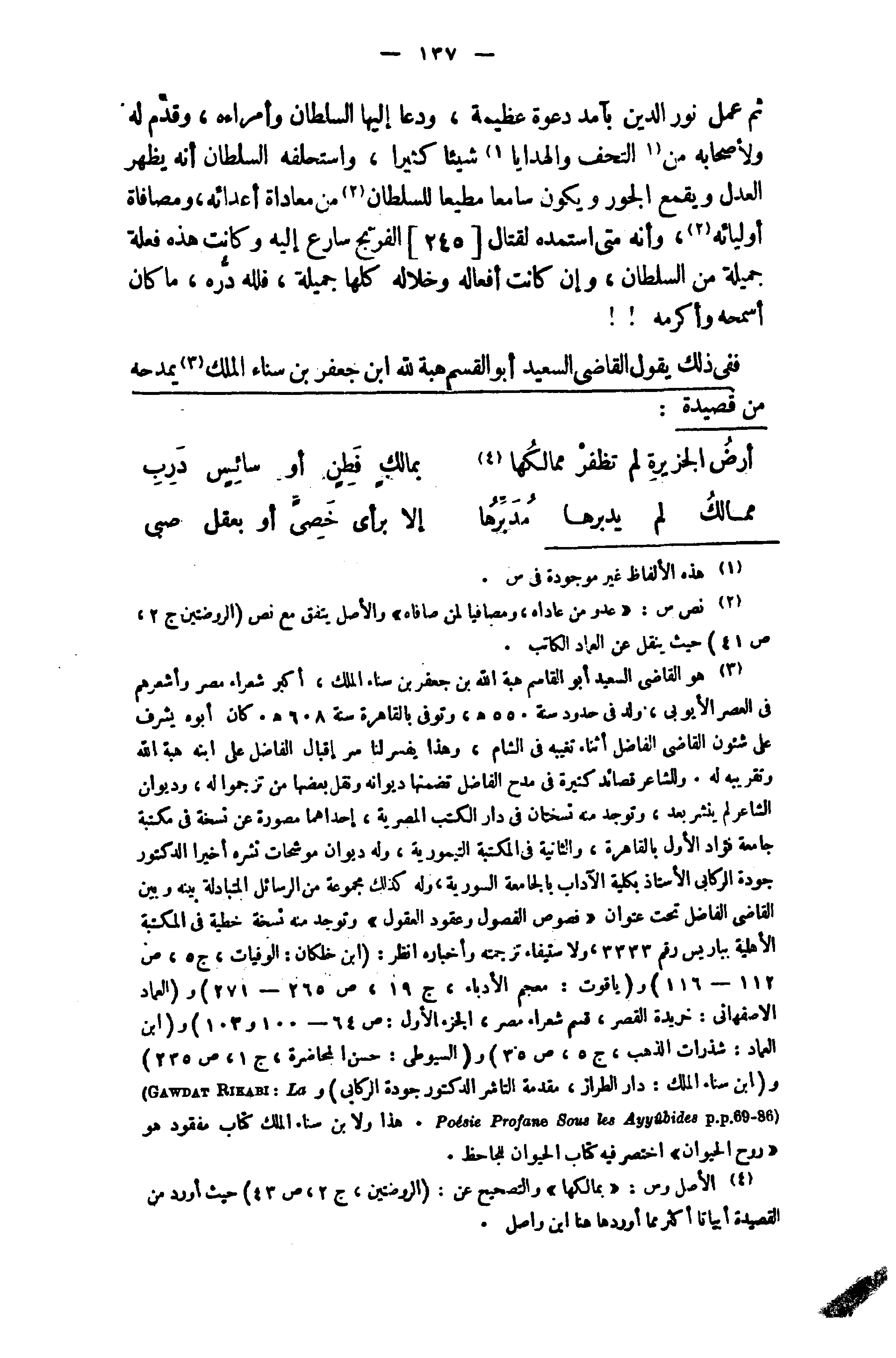 (¬3) هو القاضى السعيد أبو القاسم هبة الله بن جعفر بن سناء الملك، أكبر شعراء مصر وأشعرهم في العصر الأيوبى، ولد في حدود سنة 550 هـ، وتوفى بالقاهرة سنة 608 هـ. كان أبوه يشرف على شئون القاضى الفاضل أثناء تغيبه في الشام، وهذا يفسر لنا سر إقبال الفاضل على ابنه هبة الله وتقريبه له. وللشاعر قصائد كثيرة في مدح الفاضل تضمنها ديوانه ونقل بعضها من ترجموا له، وديوان الشاعر لم ينشر بعد، وتوجد منه نسختان في دار الكتب المصرية، إحداهما مصورة عن نسخة في مكتبة جامعة فؤاد الأول بالقاهرة، والثانية في المكتبة التيمورية، وله ديوان موشحات نشره أخيرا الدكتور جودة الركابى الأستاذ بكلية الآداب بالجامعة السورية، وله كذلك مجموعة من الرسائل المتبادلة بينه وبين القاضى الفاضل تحت عنوان «فصوص الفصول وعقود العقول» وتوجد منه نسخة خطية في المكتبة الأهلية بباريس رقم 3333، ولاستيفاء ترجمته وأخباره انظر: (ابن خلكان: الوفيات، ج 5، ص 112 - 116) و (ياقوت: معجم الأدباء، ج 19، ص 265 - 271) و (العماد الاصفهانى: خريدة القصر، قسم شعراء مصر، الجزء الأول: ص 64 - 100 و 103) و (ابن العماد: شذرات الذهب، ج 5، ص 35) و (السيوطى: حسن المحاضرة، ج 1، ص 235) و (ابن سناء الملك: دار الطراز، مقدمة الناشر الدكتور جودة الركابى) و (GAWDAT RIKABI : La Poesie Profane Sous les Ayyubides P. P. 69 - 86).