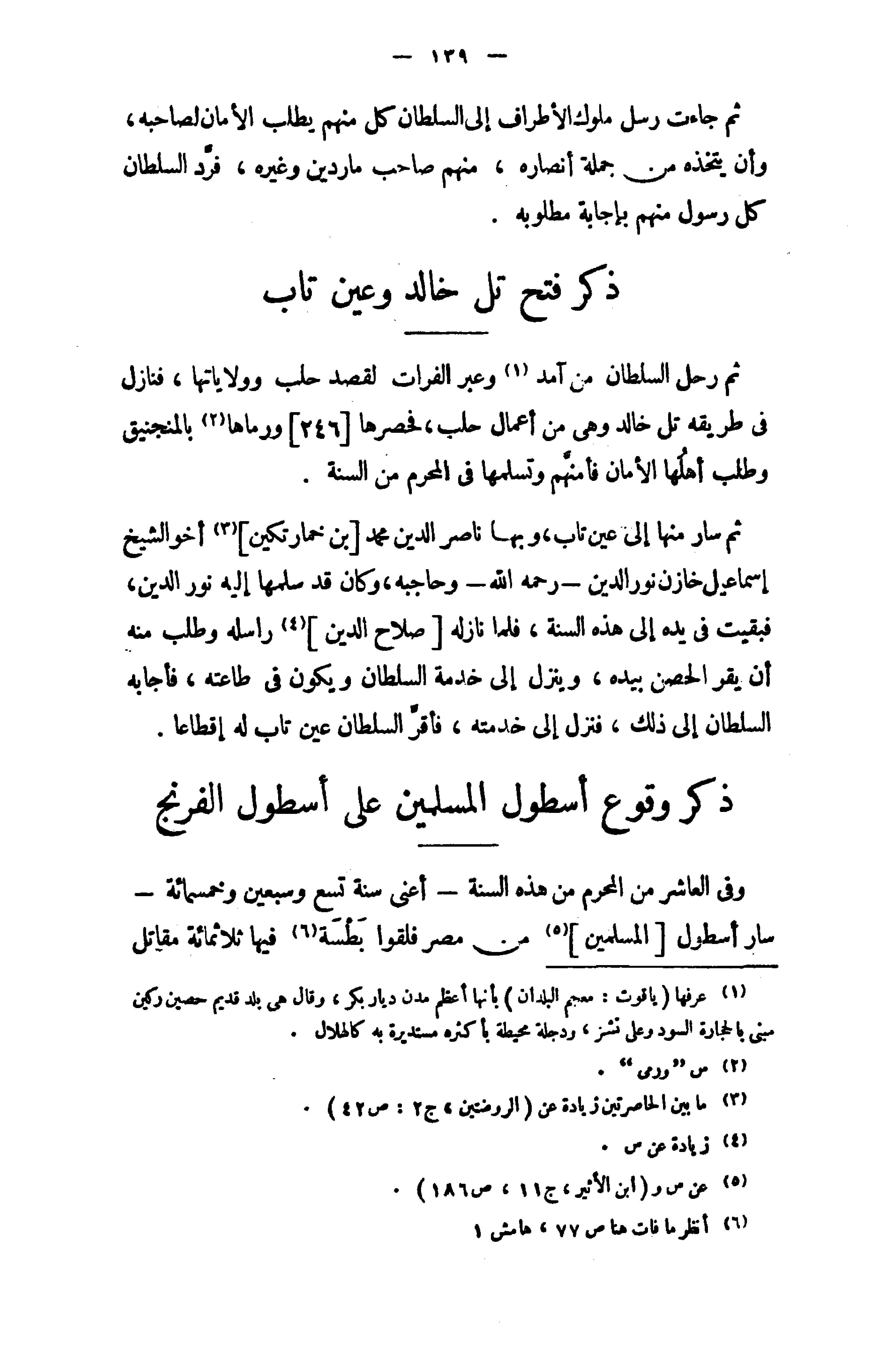 ثم رحل السلطان من آمد (¬1) وعبر الفرات لقصد حلب وولاياتها، فنازل في طريقه تل خالد وهى من أعمال حلب، فحصرها [246] ورماها (¬2) بالمنجنيق وطلب أهلها الأمان فأمنهم وتسلمها في المحرم من السنة.