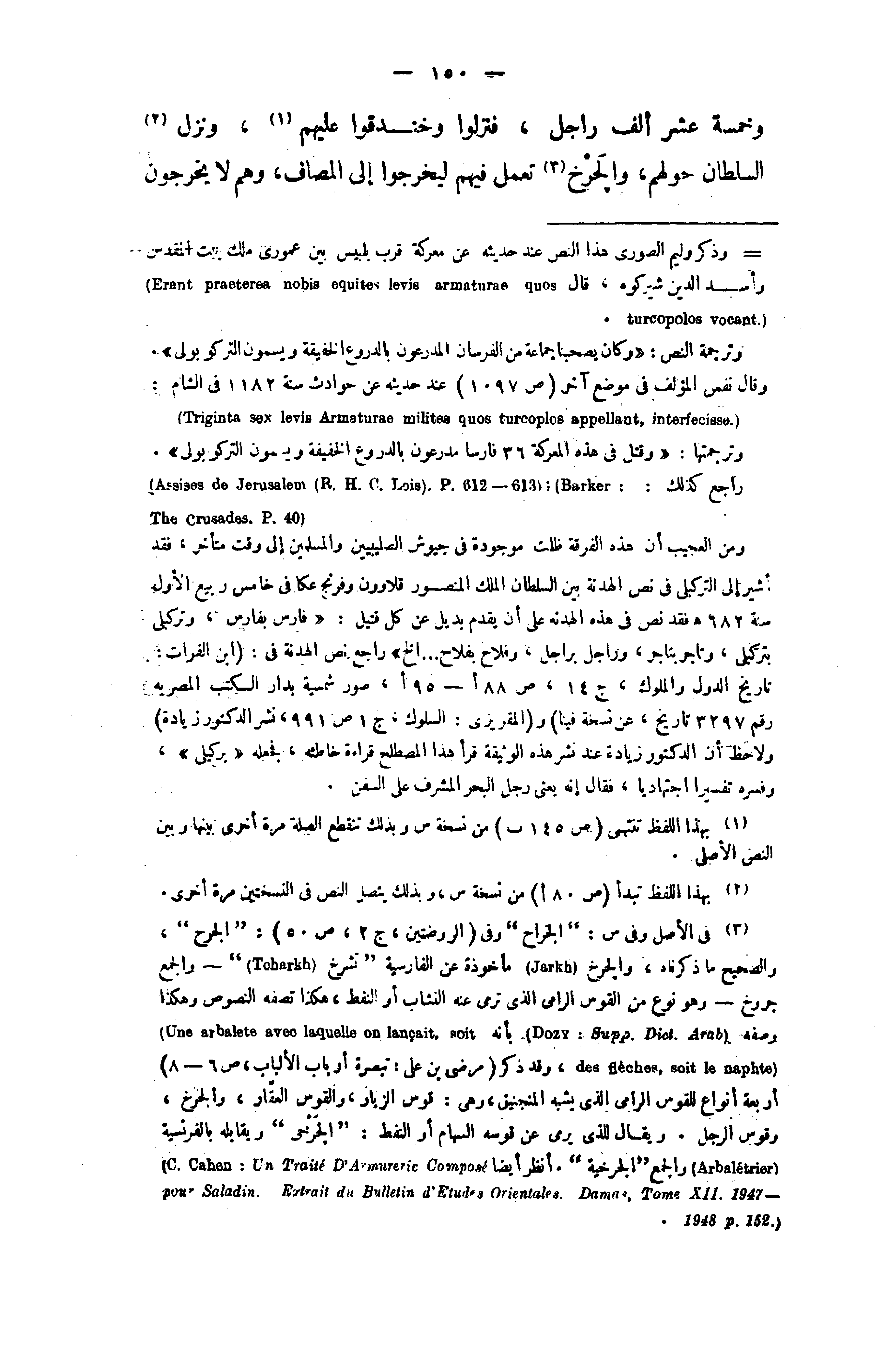 وترجمة النص: «وكان يصحبنا جماعة من الفرسان المدرعون بالدروع الخفيقة ويسمون التركوبولى». وقال نفس المؤلف في موضع آخر (ص 1097) عند حديثه عن حوادث سنة 1182 في الشام (Triginta sex levis Armaturae milites quos turcoplos appellant,interfecisse)
