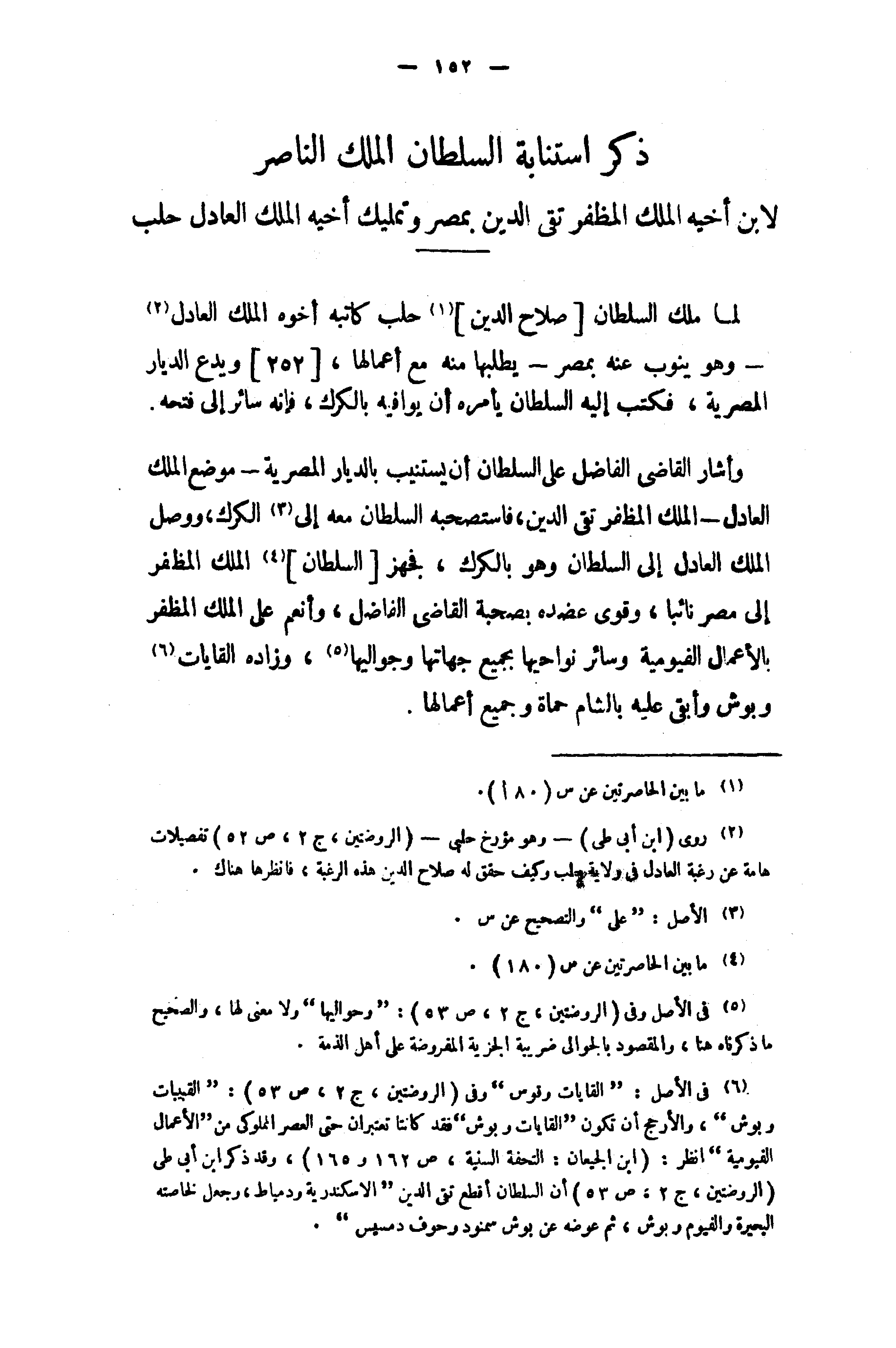 (¬2) روى (ابن أبى طى) - وهو مؤرخ حلبى - (الروضتين، ج 2، ص 52) تفصيلات هامة عن رغبة العادل في ولاية حلب وكيف حقق له صلاح الدين هذه الرغبة، فانظرها هناك.