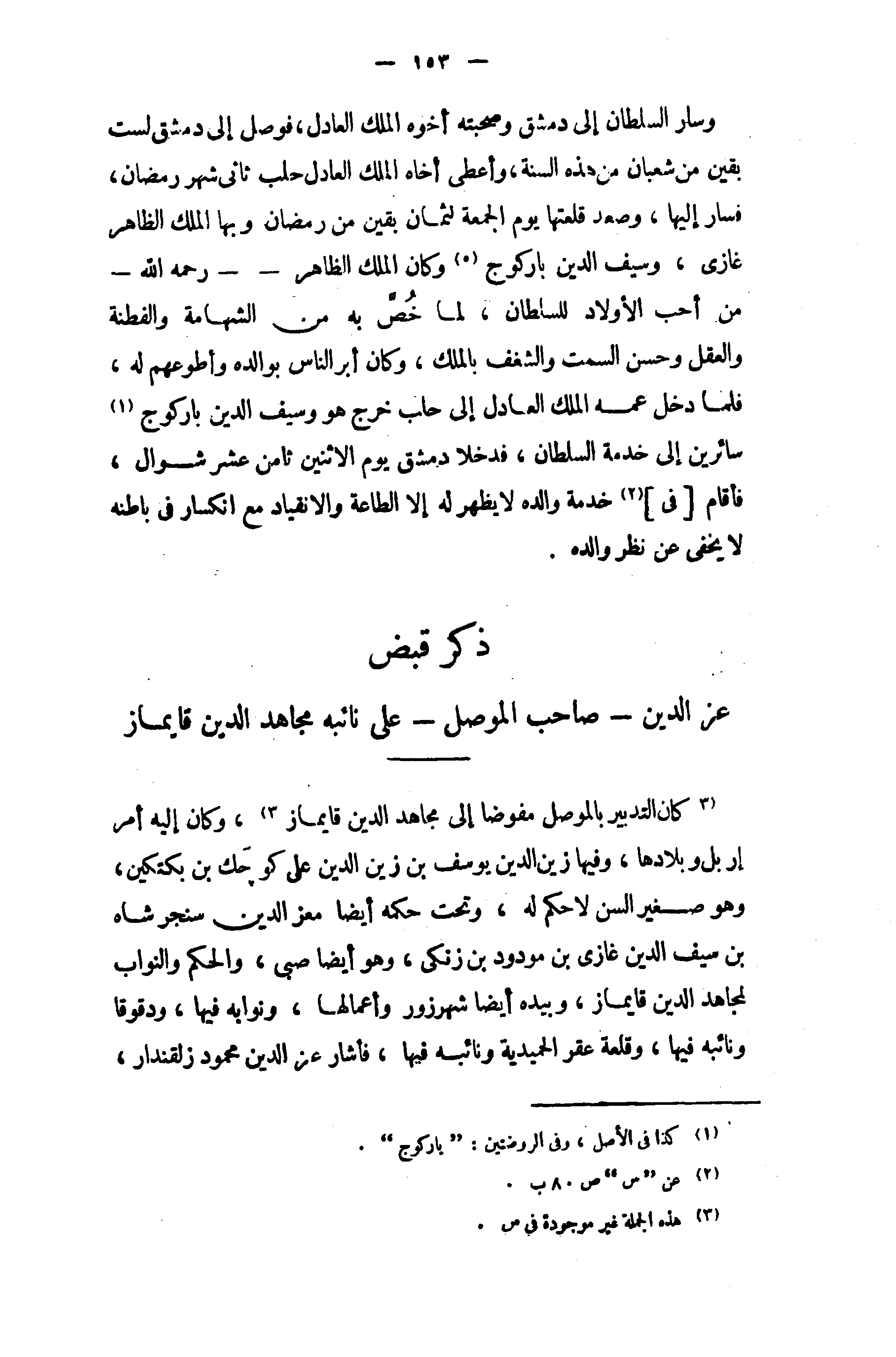 وسار السلطان إلى دمشق وصحبته أخوه الملك العادل، فوصل إلى دمشق لست بقين من شعبان من هذه السنة، وأعطى أخاه الملك العادل حلب ثانى شهر رمضان، فسار إليها، وصعد قلعتها يوم الجمعة لثمان بقين من رمضان وبها الملك الظاهر غازى، وسيف الدين باركوج (1) وكان الملك الظاهر - رحمه الله - من أحب الأولاد للسلطان، لما خصّ به من الشهامة والفطنة والعقل وحسن السمت والشغف بالملك، وكان أبر الناس بوالده وأطوعهم له، فلما دخل عمه الملك العادل إلى حلب خرج هو وسيف الدين باركوج (¬1) سائرين إلى خدمة السلطان، فدخلا دمشق يوم الاثنين ثامن عشر شوال، فأقام [في] (¬2) خدمة والده لا يظهر له إلا الطاعة والانقياد مع انكسار في باطنه لا يخفى عن نظر والده.