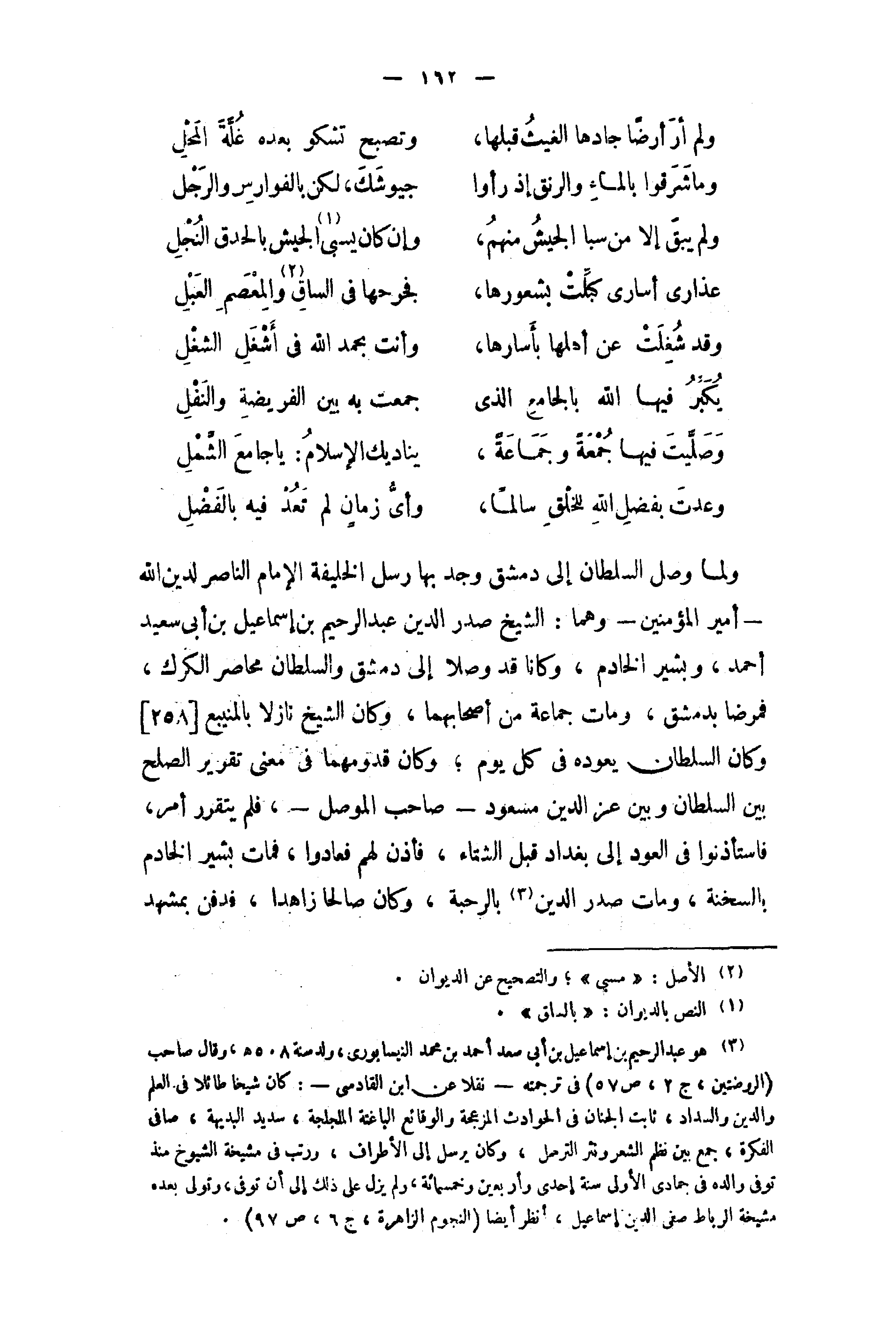 ولما وصل السلطان إلى دمشق وجد بها رسل الخليفة الإمام الناصر لدين الله - أمير المؤمنين - وهما: الشيخ صدر الدين عبد الرحيم بن إسماعيل بن أبى سعيد أحمد، وبشير الخادم، وكانا قد وصلا إلى دمشق والسلطان محاصر الكرك، فمرضا بدمشق، ومات جماعة من أصحابهما، وكان الشيخ نازلا بالمنيبع [258] وكان السلطان يعوده في كل يوم؛ وكان قدومهما في معنى تقرير الصلح بين السلطان وبين عز الدين مسعود - صاحب الموصل -، فلم يتقرر أمر، فاستأذنوا في العود إلى بغداد قبل الشتاء، فأذن لهم فعادوا، فمات بشير الخادم بالسخنة، ومات صدر الدين (¬3) بالرحبة، وكان صالحا زاهدا، فدفن بمشهد