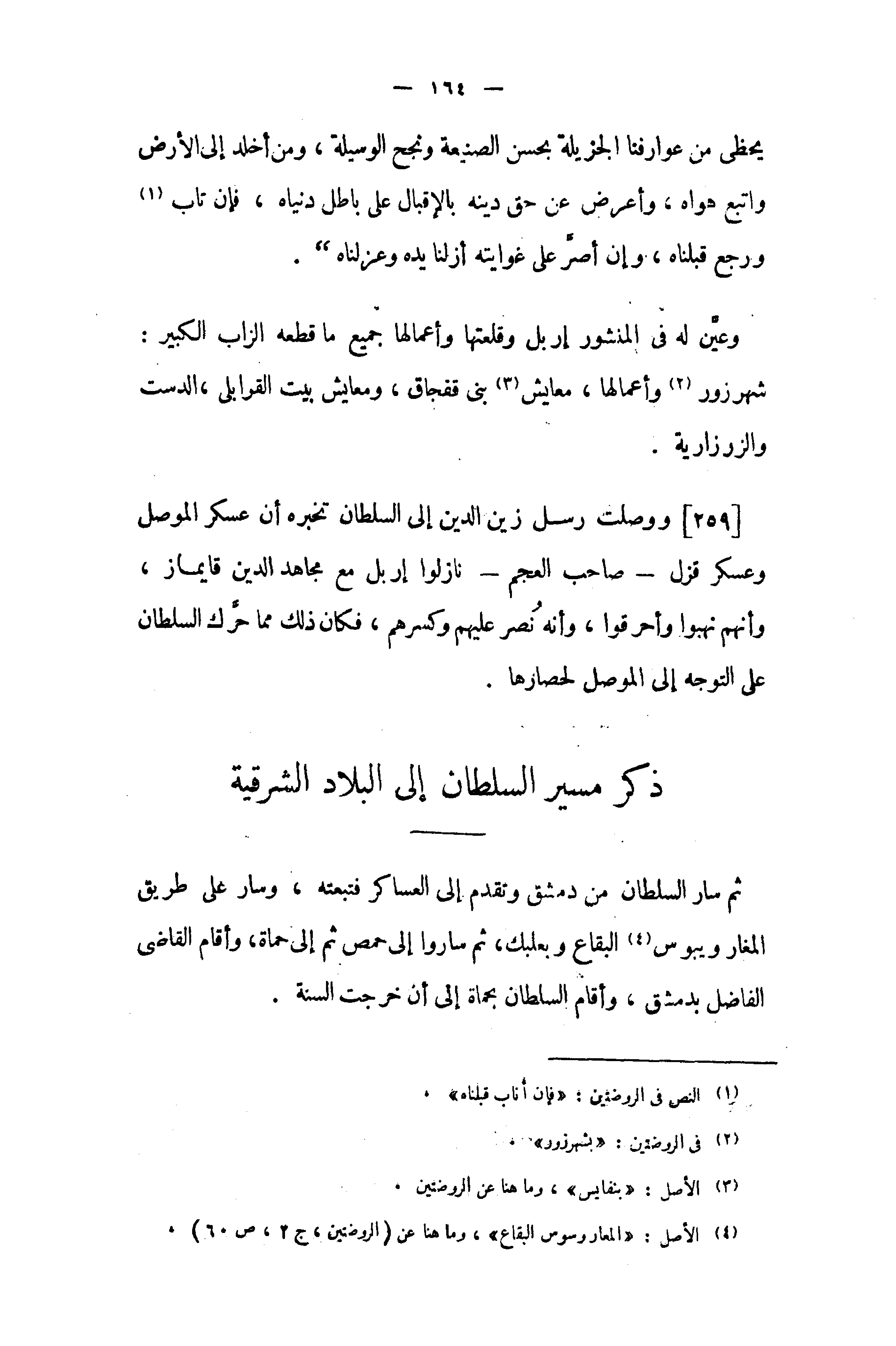 [259] ووصلت رسل زين الدين إلى السلطان تخبره أن عسكر الموصل وعسكر قزل - صاحب العجم - نازلوا إربل مع مجاهد الدين قايماز، وأنهم نهبوا وأحرقوا، وأنه نصر عليهم وكسرهم، فكان ذلك مما حرّك السلطان على التوجه إلى الموصل لحصارها.