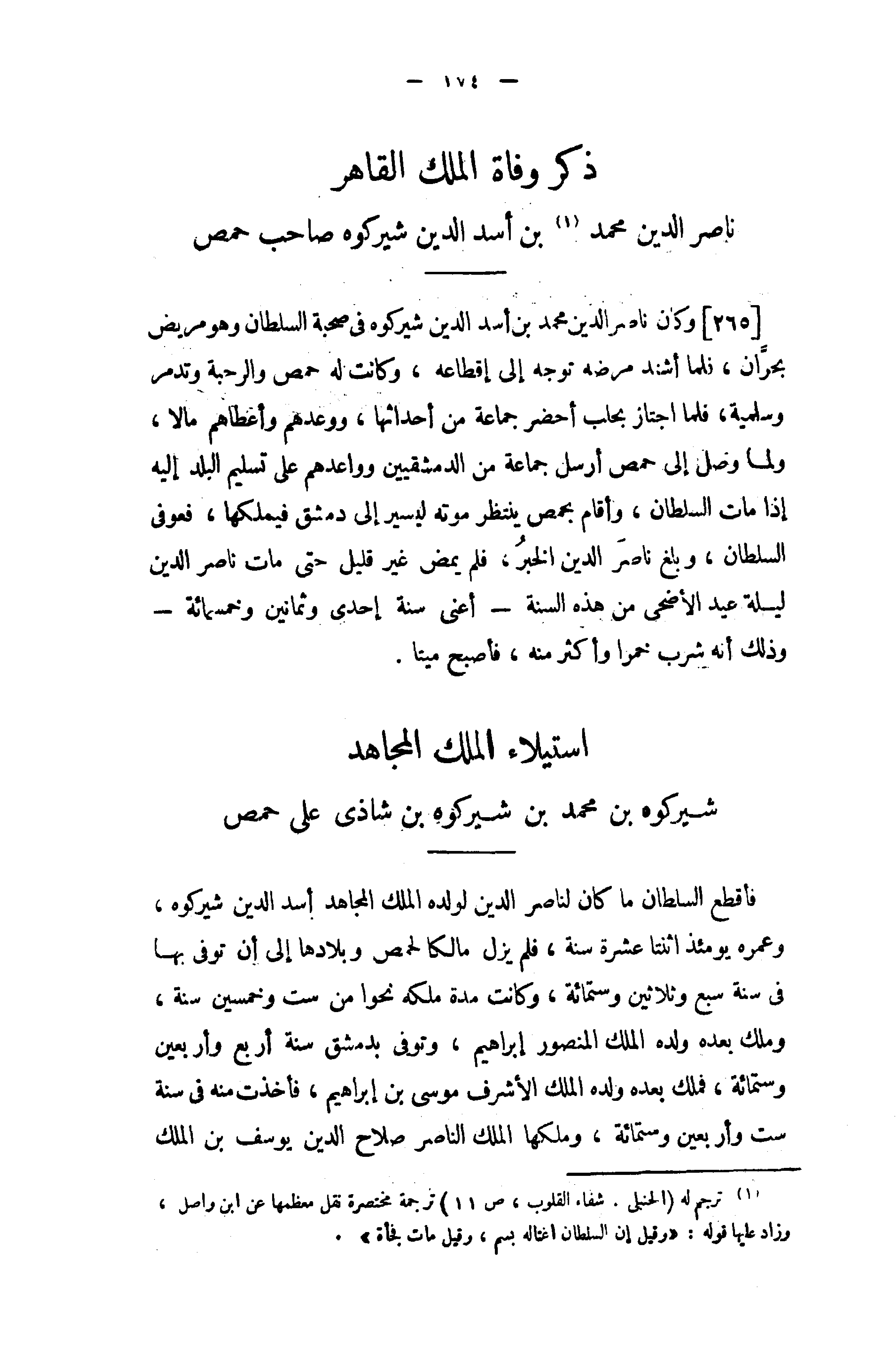[265] وكان ناصر الدين محمد بن أسد الدين شير كوه في صحبة السلطان وهو مريض بحرّان، فلما أشند مرضه توجه إلى إقطاعه، وكانت له حمص والرحبة وتدمر وسلمية، فلما اجتاز بحلب أحضر جماعة من أحداثها، ووعدهم وأعطاهم مالا، ولما وصل إلى حمص أرسل جماعة من الدمشقيين وواعدهم على تسليم البلد إليه إذا مات السلطان، وأقام بحمص ينتظر موته ليسير إلى دمشق فيملكها، فعوفى السلطان، وبلغ ناصر الدين الخبر، فلم يمض غير قليل حتى مات ناصر الدين ليلة عيد الأضحى من هذه السنة - أعنى سنة إحدى وثمانين وخمسمائة - وذلك أنه شرب خمرا وأكثر منه، فأصبح ميتا.