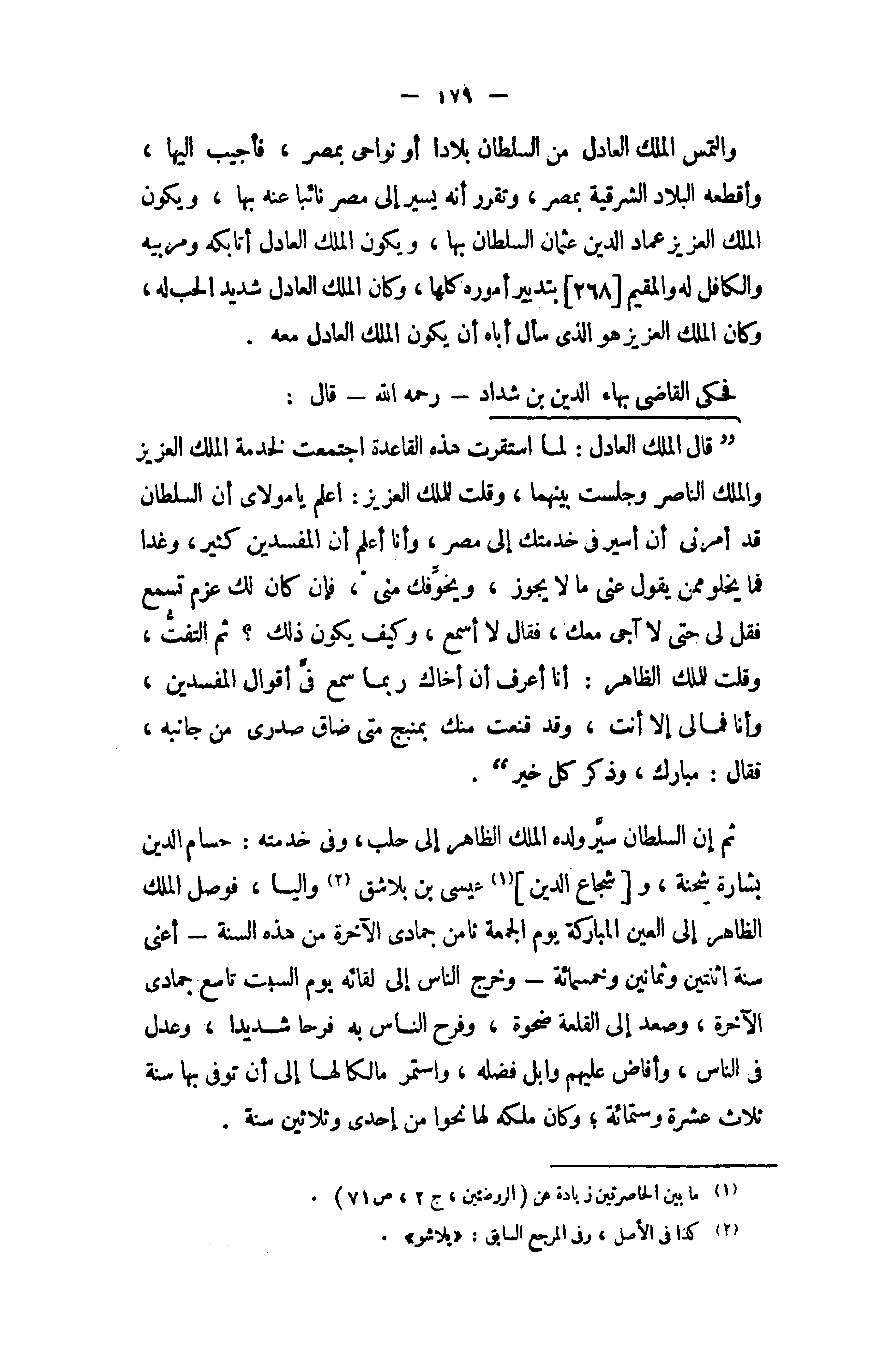 " قال الملك العادل: لما استقرت هذه القاعدة اجتمعت لخدمة الملك العزيز والملك الناصر وجلست بينهما، وقلت للملك العزيز: اعلم يا مولاى أن السلطان قد أمرنى أن أسير في خدمتك إلى مصر، وأنا أعلم أن المفسدين كثير، وغدا فما يخلو ممن يقول عنى ما لا يجوز، ويخوّفك منى، فإن كان لك عزم تسمع فقل لى حتى لا آجى معك، فقال لا أسمع، وكيف يكون ذلك؟ ثم التفتّ، وقلت للملك الظاهر: أنا أعرف أن أخاك ربما سمع فىّ أقوال المفسدين، وأنا فما لى إلا أنت، وقد قنعت منك بمنبج متى ضاق صدرى من جانبه، فقال: مبارك، وذكر كل خير ".