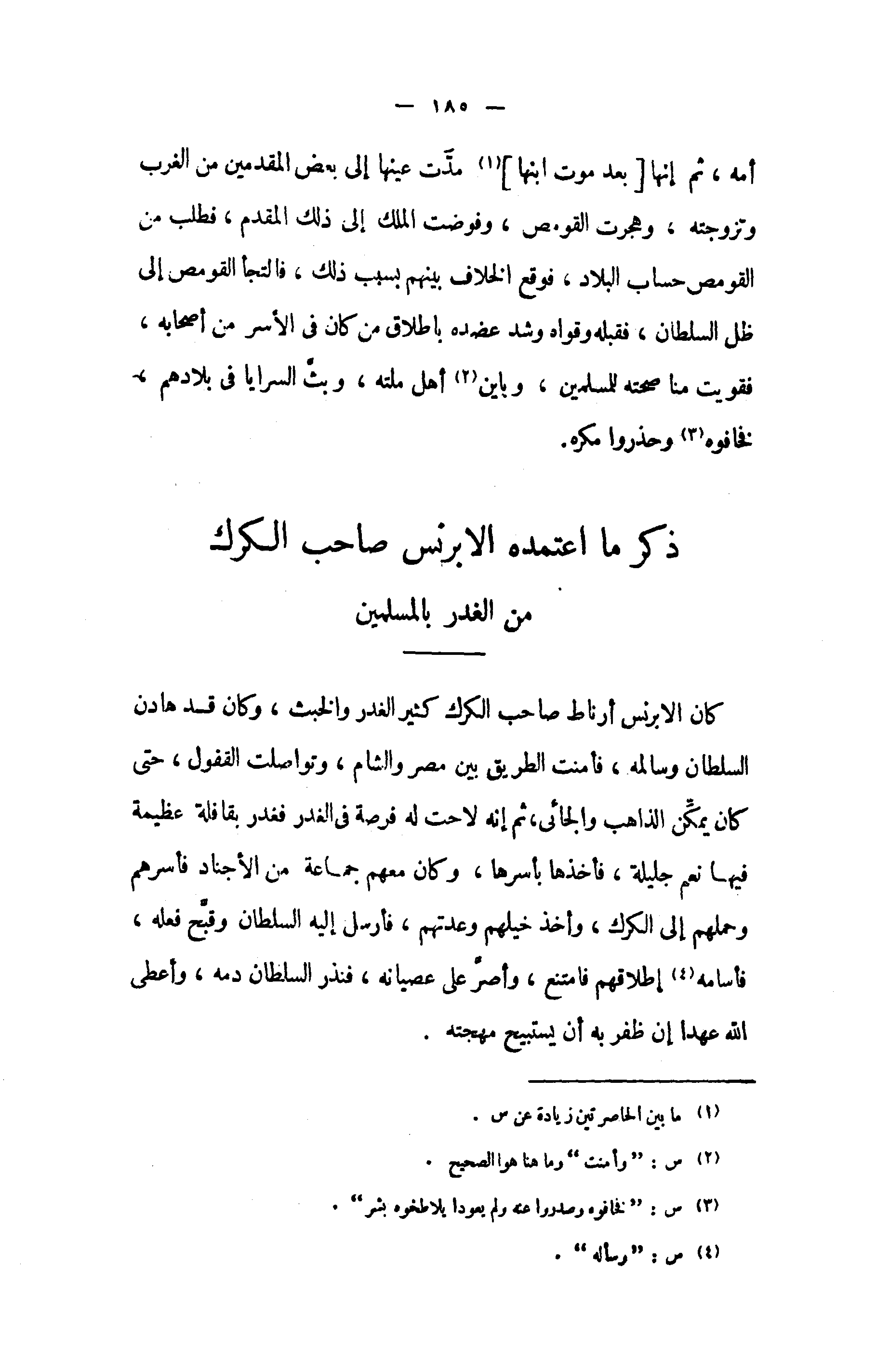 كان الابرنس أرناط صاحب الكرك كثير الغدر والخبث، وكان قد هادن السلطان وسالمه، فأمنت الطريق بين مصر والشام، وتواصلت القفول، حتى كان يمكّن الذاهب والجائى، ثم إنه لاحت له فرصة في الغدر فغدر بقافلة عظيمة فيها نعم جليلة، فأخذها بأسرها، وكان معهم جماعة من الأجناد فأسرهم وحملهم إلى الكرك، وأخذ خيلهم وعدتهم، فأرسل إليه السلطان وقبّح فعله، فأسامه (¬4) إطلاقهم فامتنع، وأصرّ على عصيانه، فنذر السلطان دمه، وأعطى الله عهدا إن ظفر به أن يستبيح مهجته.