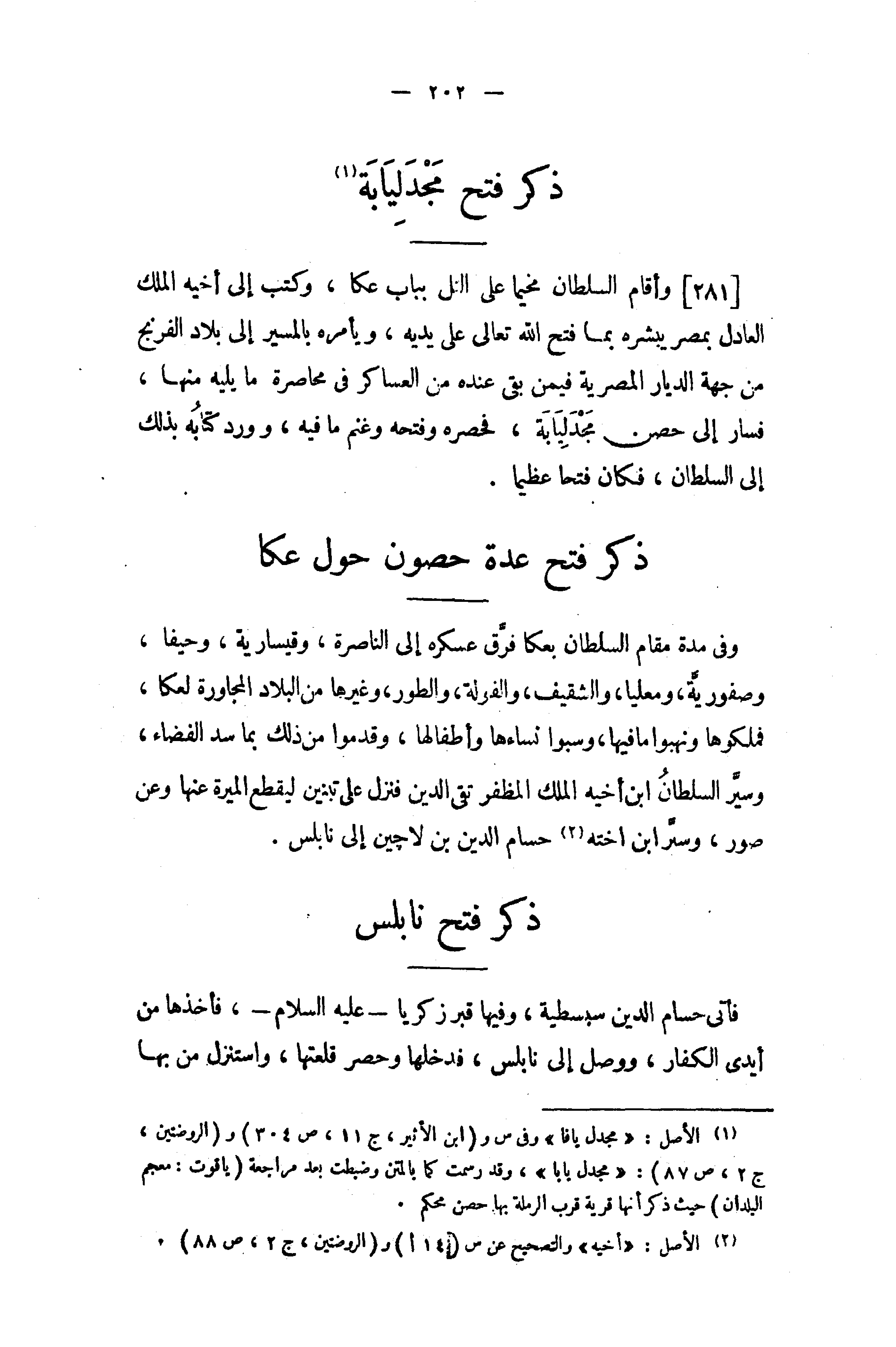 [281] وأقام السلطان مخيما على النل بباب عكا، وكتب إلى أخيه الملك العادل بمصر يبشره بما فتح الله تعالى على يديه، ويأمره بالمسير إلى بلاد الفرنج من جهة الديار المصرية فيمن بقى عنده من العساكر في محاصرة ما يليه منها، فسار إلى حصن مجدليابة، فحصره وفتحه وغنم ما فيه، وورد كتابه بذلك إلى السلطان، فكان فتحا عظيما.