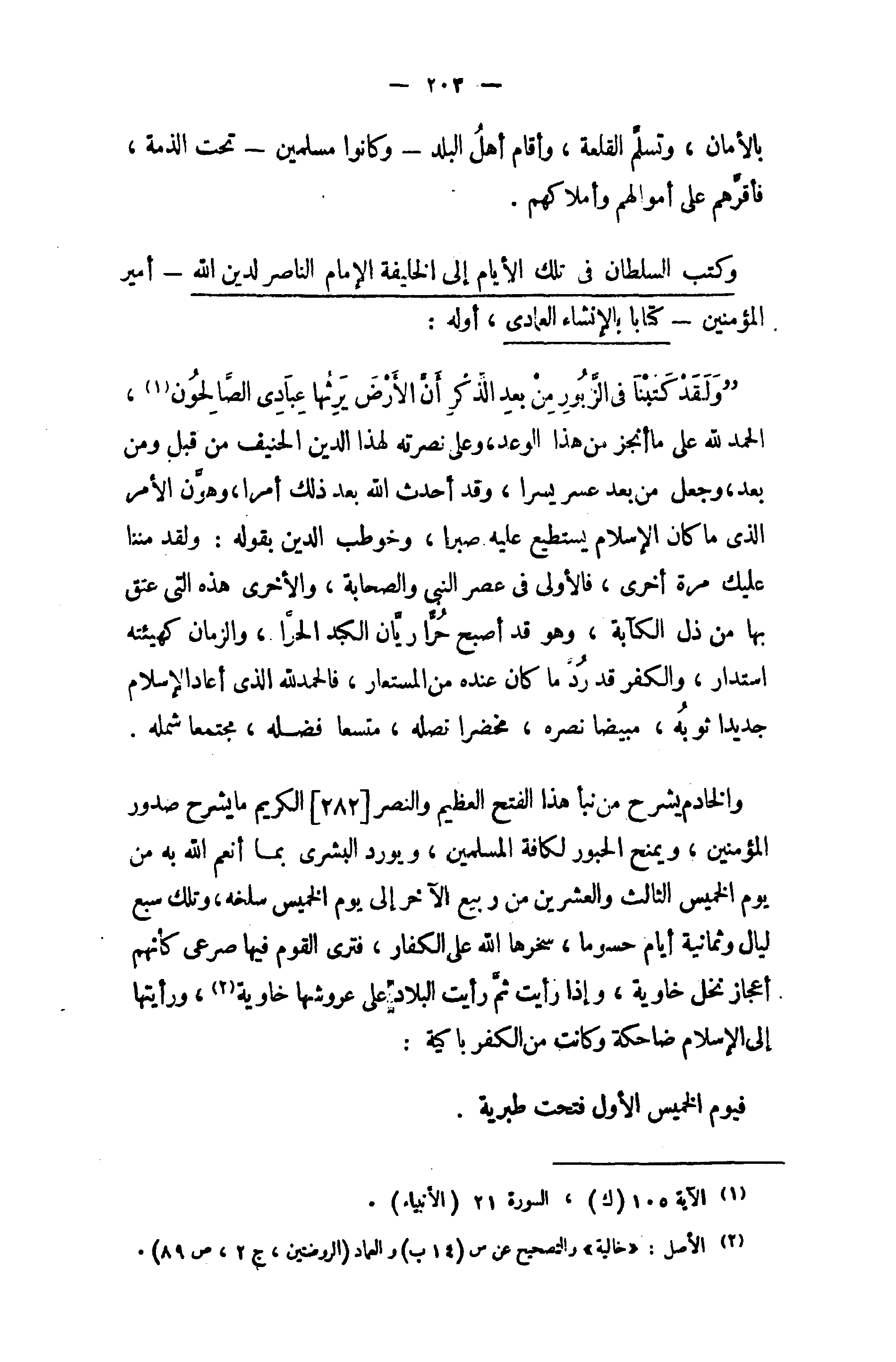 {" وَلَقَدْ كَتَبْنا فِي الزَّبُورِ مِنْ بَعْدِ الذِّكْرِ أَنَّ الْأَرْضَ يَرِثُها عِبادِيَ الصّالِحُونَ (¬1)}، الحمد لله على ما أنجز من هذا الوعد، وعلى نصرته لهذا الدين الحنيف من قبل ومن بعد، وجعل من بعد عسر يسرا، وقد أحدث الله بعد ذلك أمرا، وهوّن الأمر الذى ما كان الإسلام يستطيع عليه صبرا، وخوطب الدين بقوله: ولقد مننا عليك مرة أخرى، فالأولى في عصر النبى والصحابة، والأخرى هذه التي عتق بها من ذل الكآبة، وهو قد أصبح حرّا ريّان الكبد الحرّا، والزمان كهيئته استدار، والكفر قد ردّما كان عنده من المستعار، فالحمد لله الذى أعاد الإسلام جديدا ثوبه، مبيضا نصره، مخضرا نصله، متسعا فضله، مجتمعا شمله.