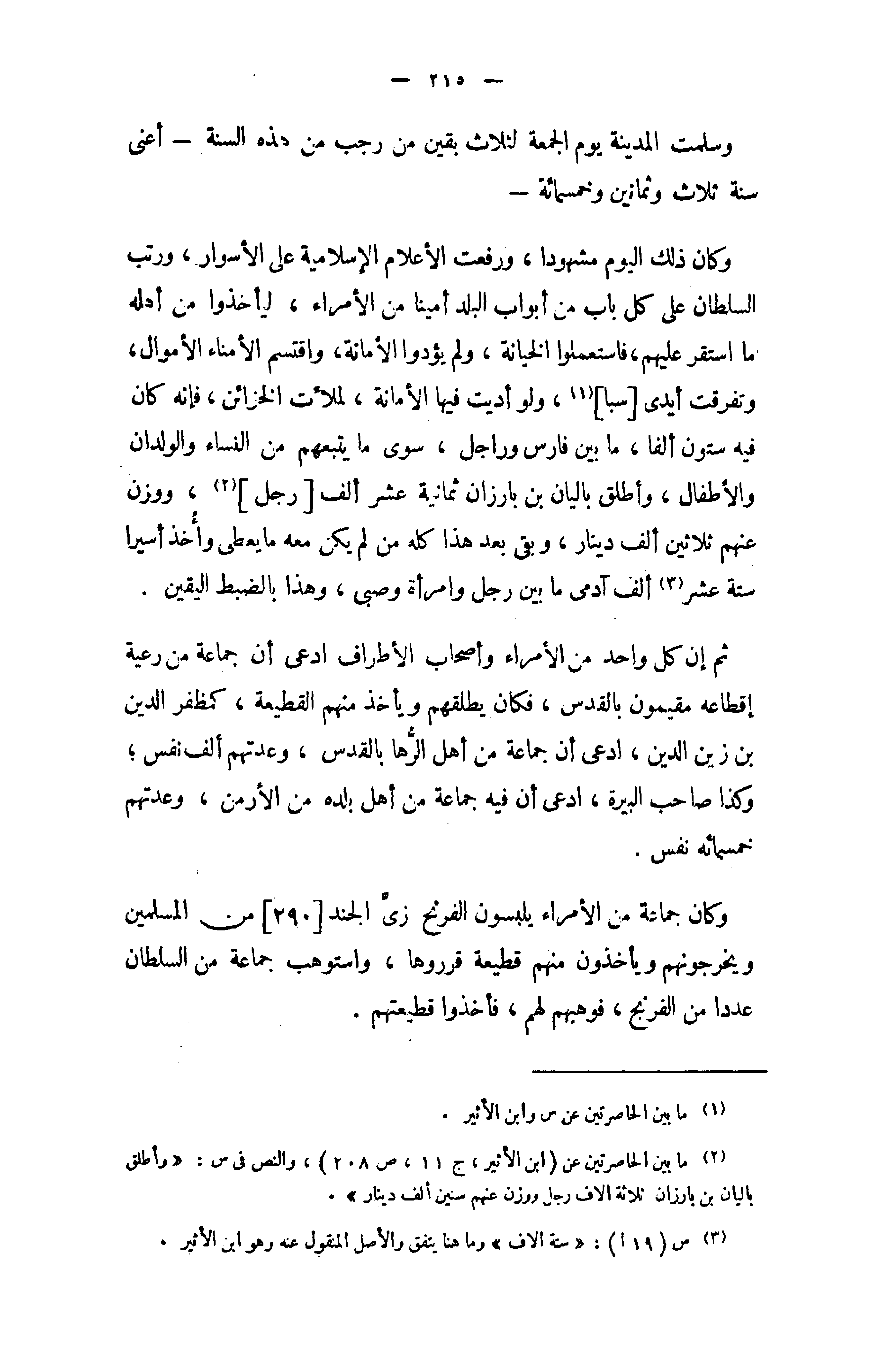 وكان ذلك اليوم مشهودا، ورفعت الأعلام الإسلامية على الأسوار، ورتب السلطان على كل باب من أبواب البلد أمينا من الأمراء، ليأخذوا من أهله ما استقر عليهم، فاستعملوا الخيانة، ولم يؤدوا الأمانة، واقتسم الأمناء الأموال، وتفرقت أيدى [سبا] (¬1)، ولو أديت فيها الأمانة، لملأت الخزائن، فإنه كان فيه ستون ألفا، ما بين فارس وراجل، سوى ما يتبعهم من النساء والولدان والأطفال، وأطلق باليان بن بارزان ثمانية عشر ألف [رجل] (¬2)، ووزن عنهم ثلاثين ألف دينار، وبقى بعد هذا كله من لم يكن معه ما يعطى وأخذ أسيرا ستة عشر (¬3) ألف آدمى ما بين رجل وامرأة وصبى، وهذا بالضبط اليقين.