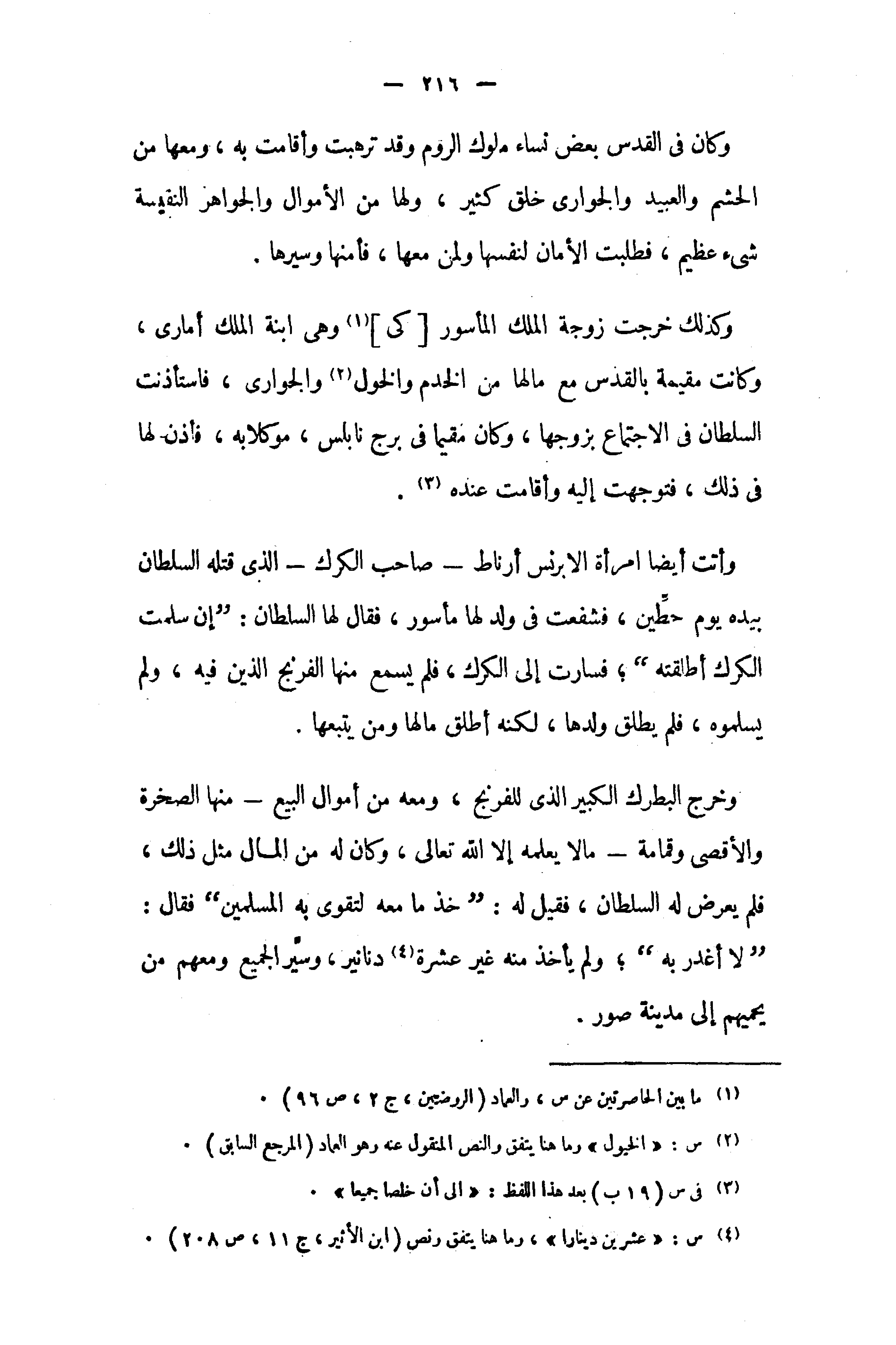 وكان في القدس بعض نساء ملوك الروم وقد ترهبت وأقامت به، ومعها من الحشم والعبيد والجوارى خلق كثير، ولها من الأموال والجواهر النقيسة شىء عظيم، فطلبت الأمان لنفسها ولمن معها، فأمنها وسيرها.