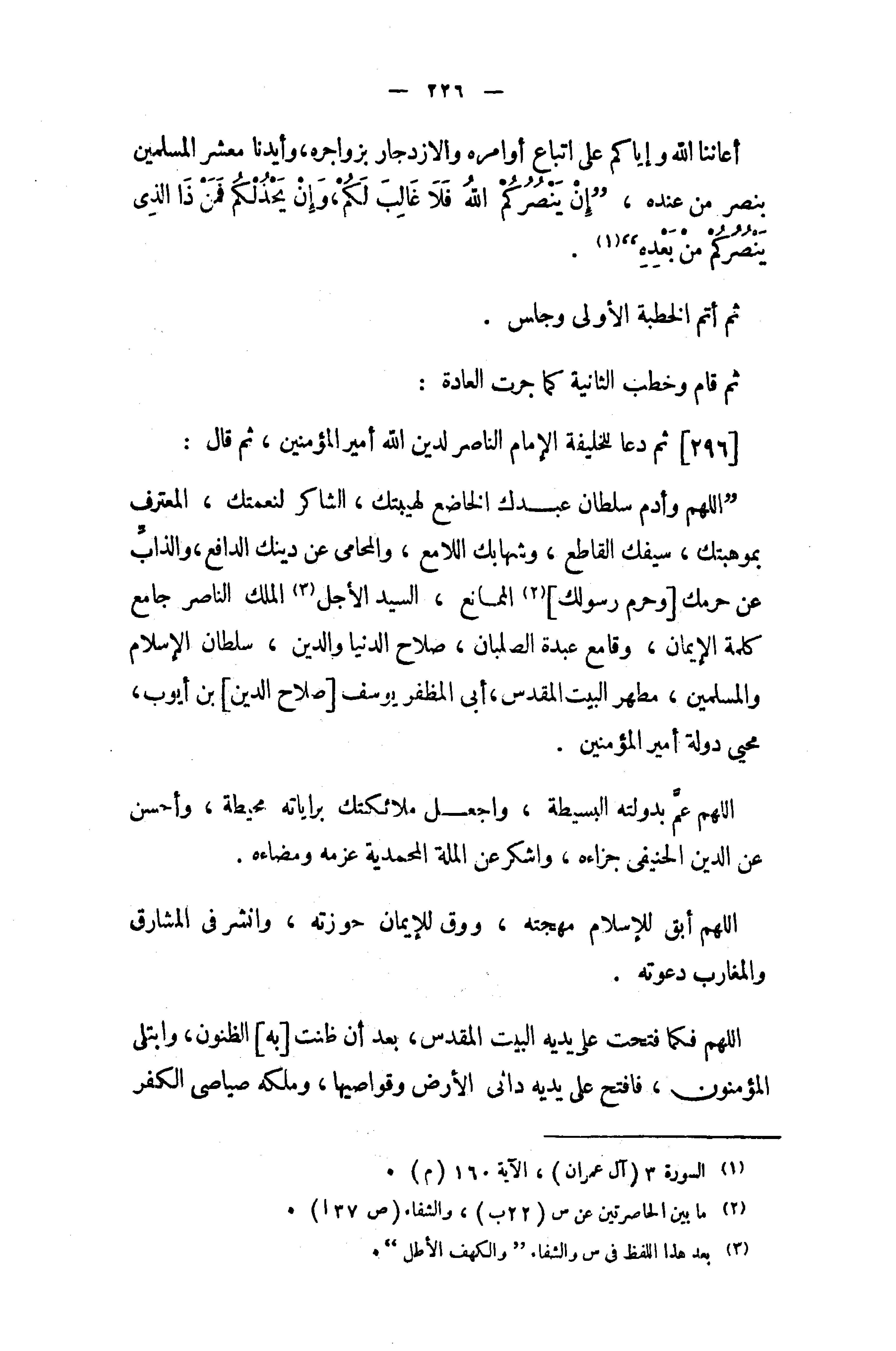 [296] ثم دعا للخليفة الإمام الناصر لدين الله أمير المؤمنين، ثم قال: