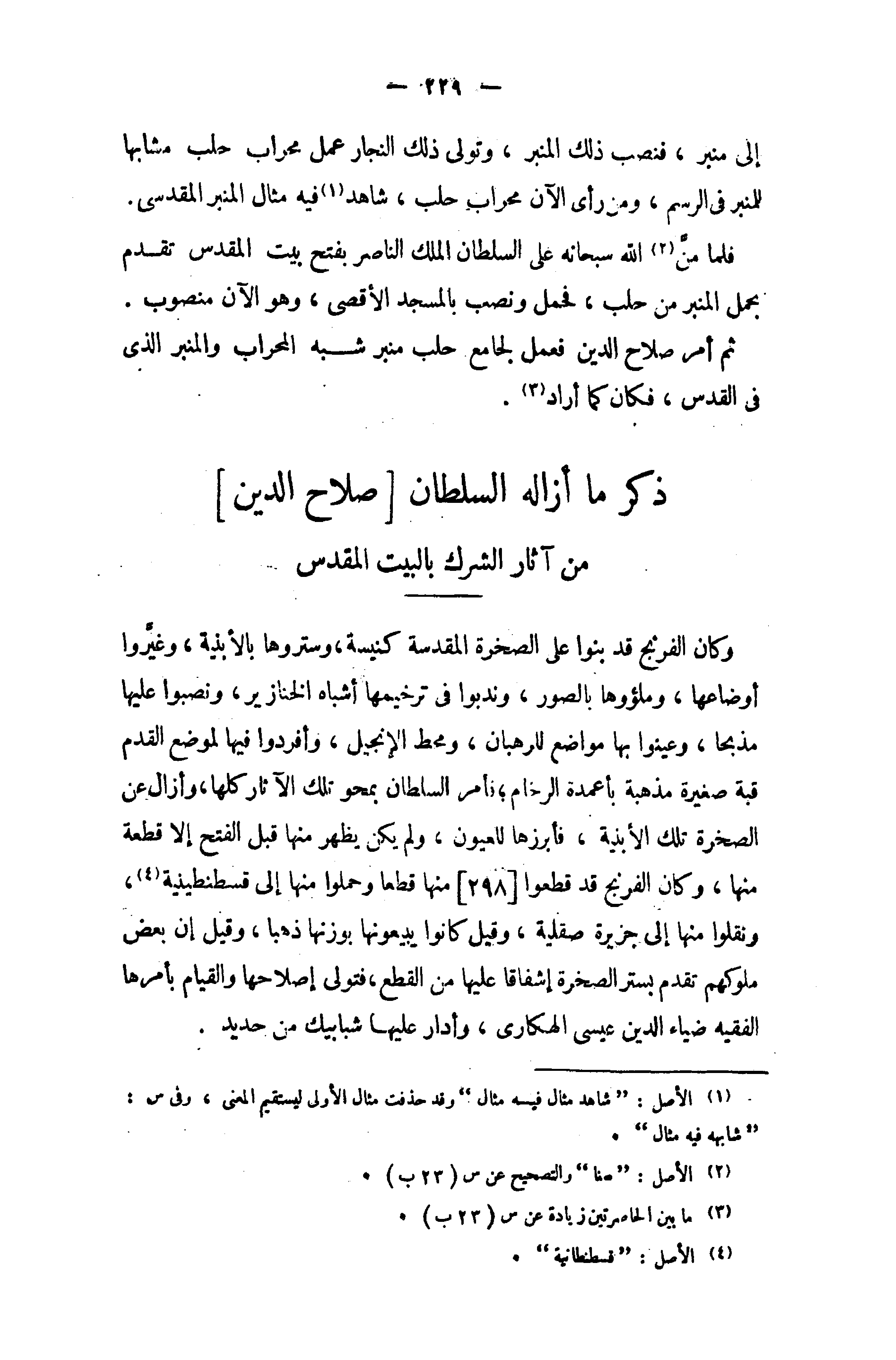 وكان الفرنج قد بنوا على الصخرة المقدسة كنيسة، وستروها بالأبنية، وغيّروا أوضاعها، وملؤوها بالصور، وندبوا في ترخيمها أشباه الخنازير، ونصبوا عليها مذبحا، وعينوا بها مواضع للرهبان، ومحط الإنجيل، وأفردوا فيها لموضع القدم قبة صغيرة مذهبة بأعمدة الرخام؛ فأمر السلطان بمحو تلك الآثار كلها، وأزال عن الصخرة تلك الأبنية، فأبرزها للعيون، ولم يكن يظهر منها قبل الفتح إلا قطعة منها، وكان الفرنج قد قطعوا [298] منها قطعا وحملوا منها إلى قسطنطينية (¬4)، ونقلوا منها إلى جزيرة صقلية، وقيل كانوا يبيعونها بوزنها ذهبا، وقيل إن بعض ملوكهم تقدم بستر الصخرة إشفاقا عليها من القطع، فتولى إصلاحها والقيام بأمرها الفقيه ضياء الدين عيسى الهكارى، وأدار عليها شبابيك من حديد.