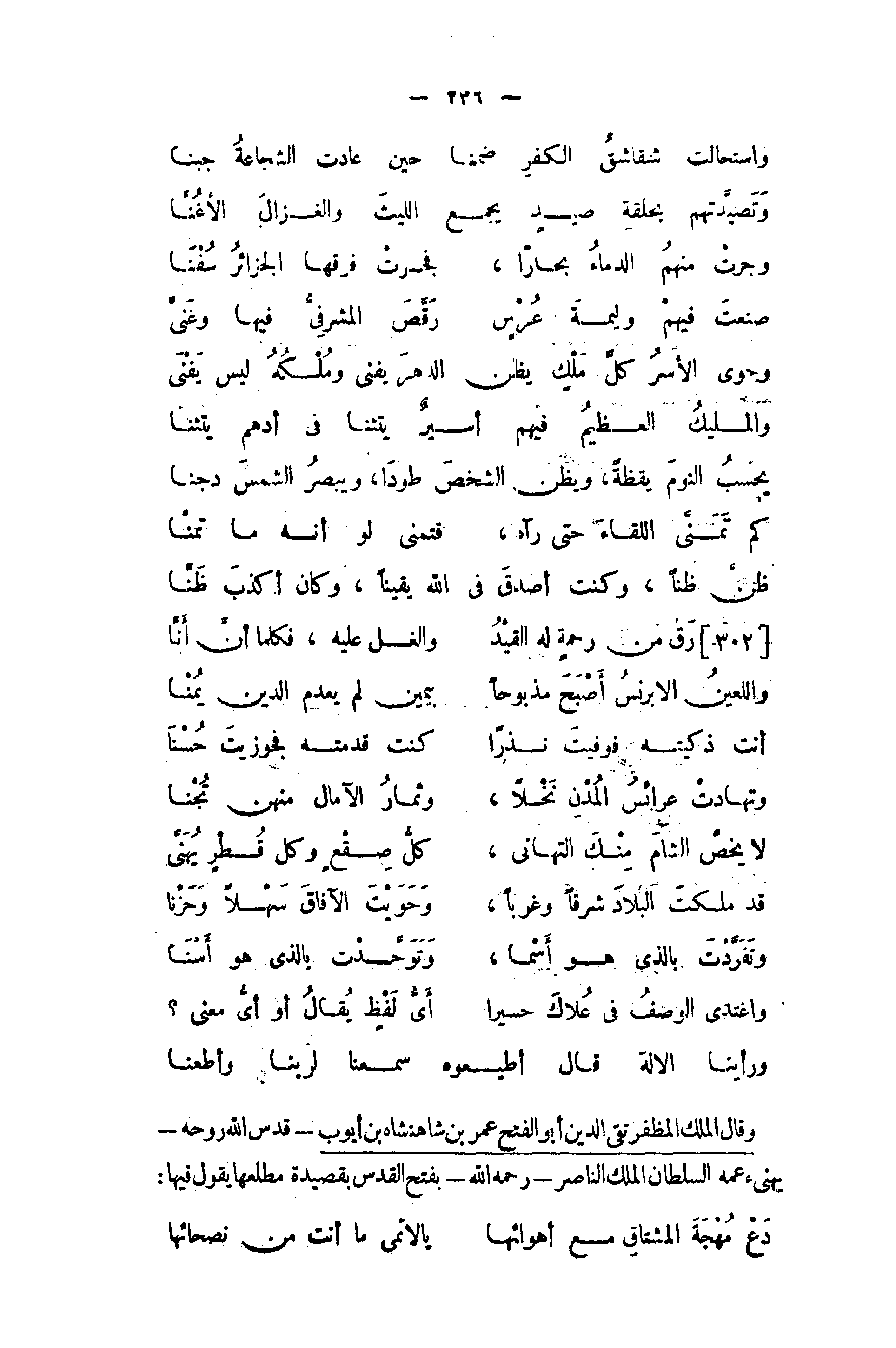 وقال الملك المظفر تقى الدين أبو الفتح عمر بن شاهنشاه بن أيوب - قدس الله روحه - يهنىء عمه السلطان الملك الناصر - رحمه الله - بفتح القدس بقصيدة مطلعها يقول فيها: