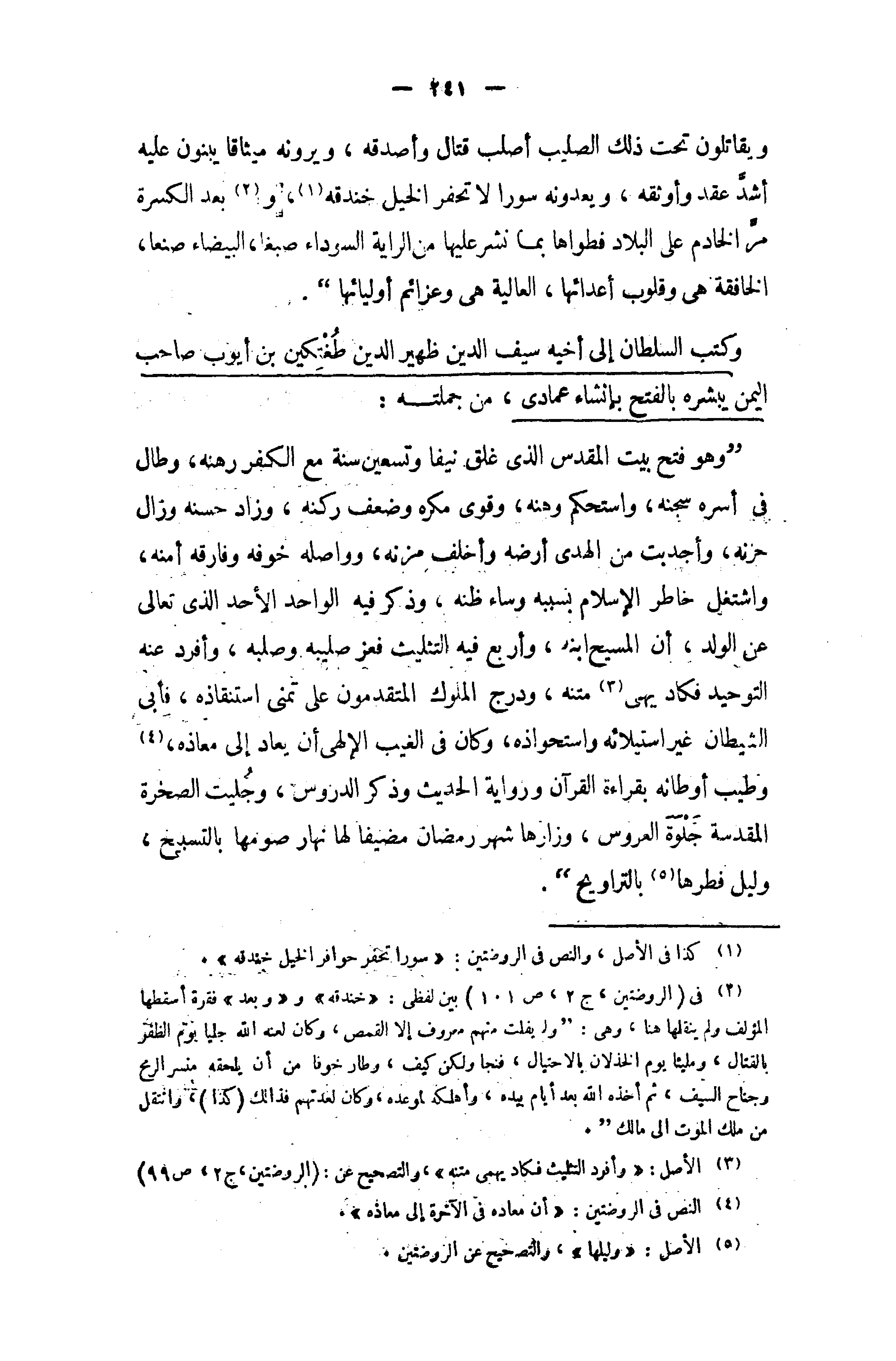 " وهو فتح بيت المقدس الذى غلق نيفا وتسعين سنة مع الكفر رهنه، وطال في أسره سجنه، واستحكم وهنه، وقوى مكره وضعف ركنه، وزاد حسنه وزال حزنه، وأجدبت من الهدى أرضه وأخلف مزنه، وواصله خوفه وفارقه أمنه، واشتغل خاطر الإسلام بسببه وساء ظنه، وذكر فيه الواحد الأحد الذى تعالى عن الولد، أن المسيح ابنه، وأربع فيه التثليث فعز صليبه وصلبه، وأفرد عنه التوحيد فكاديهى (¬3) متنه، ودرج الملوك المتقدمون على تمنى استنقاذه، فأبى الشيطان غير استيلائه واستحواذه، وكان في الغيب الإلهى أن يعاد إلى معاذه، (¬4) وطيب أوطانه بقراءة القرآن ورواية الحديث وذكر الدروس، وجليت الصخرة المقدسة جلوة العروس، وزارها شهر رمضان مضيفا لها نهار صومها بالتسبيح، وليل فطرها (¬5) بالتراويح ".