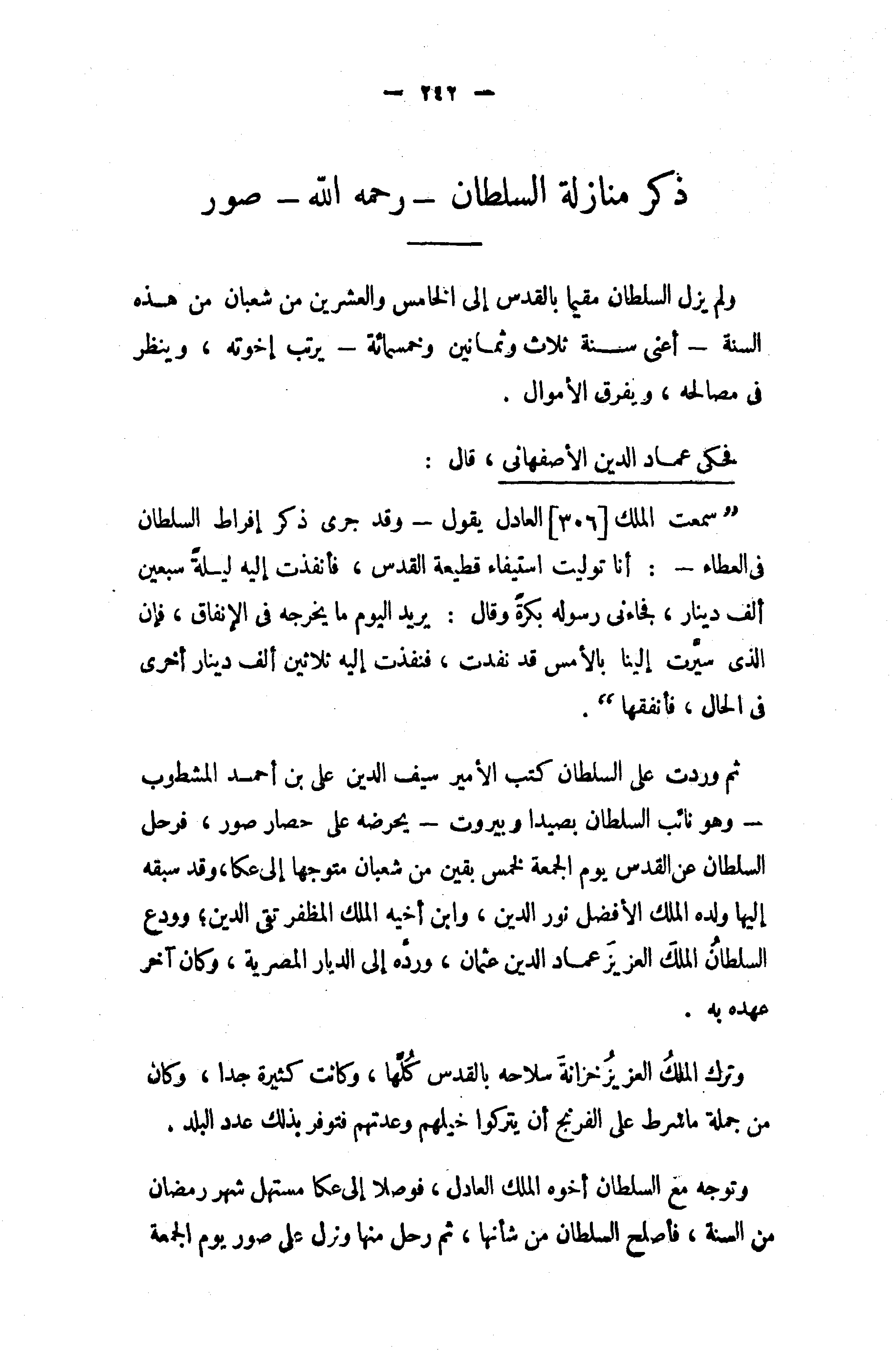 ولم يزل السلطان مقيما بالقدس إلى الخامس والعشرين من شعبان من هذه السنة - أعنى سنة ثلاث وثمانين وخمسمائة - يرتب إخوته، وينظر في مصالحه، ويفرق الأموال.