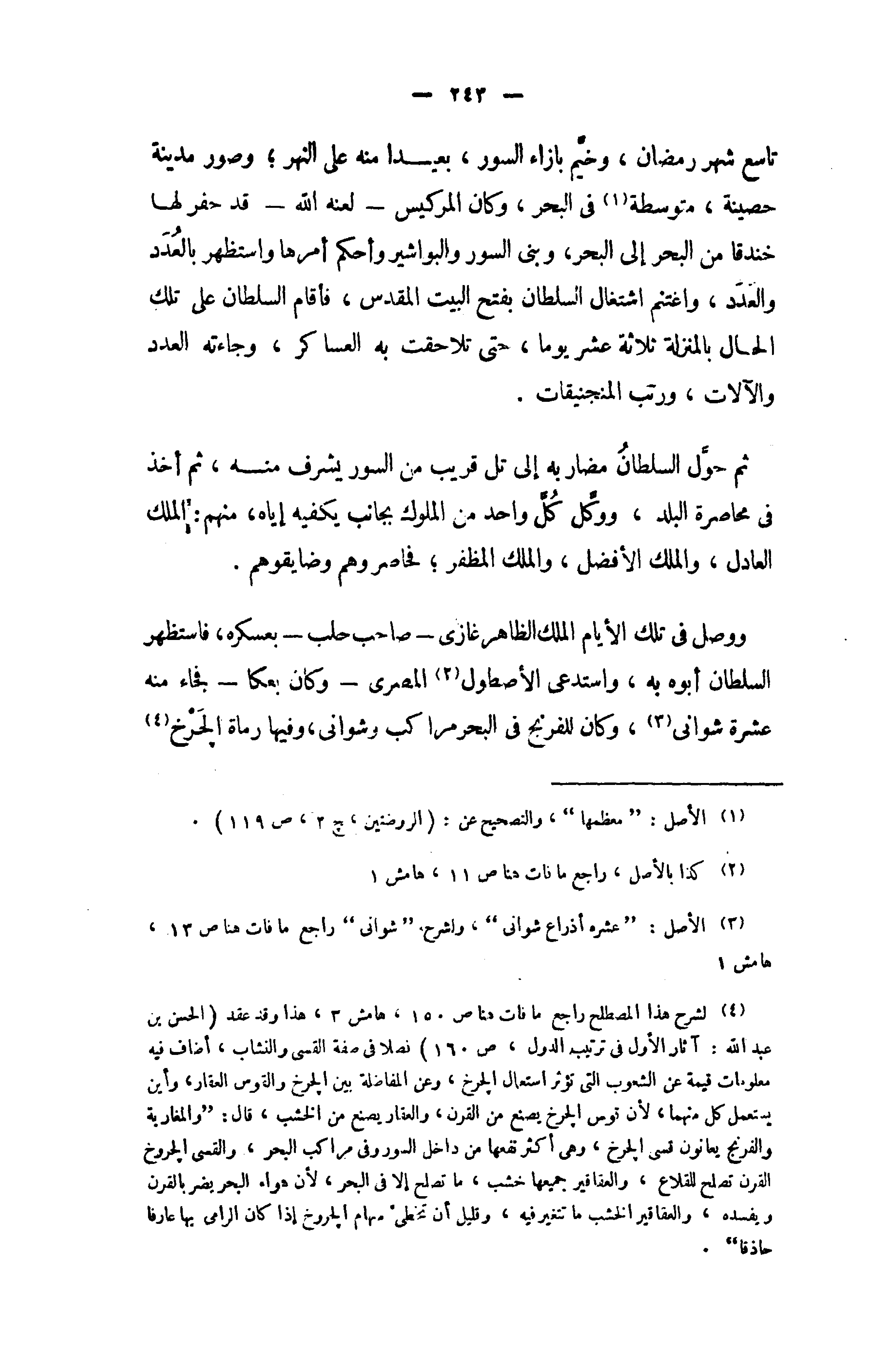 ووصل في تلك الأيام الملك الظاهر غازى - صاحب حلب - بعسكره، فاستظهر السلطان أبوه به، واستدعى الأصطول (¬2) المصرى - وكان بعكا - فجاء منه عشرة شوانى (¬3)، وكان للفرنج في البحر مراكب وشوانى، وفيها رماة الجرخ (¬4)