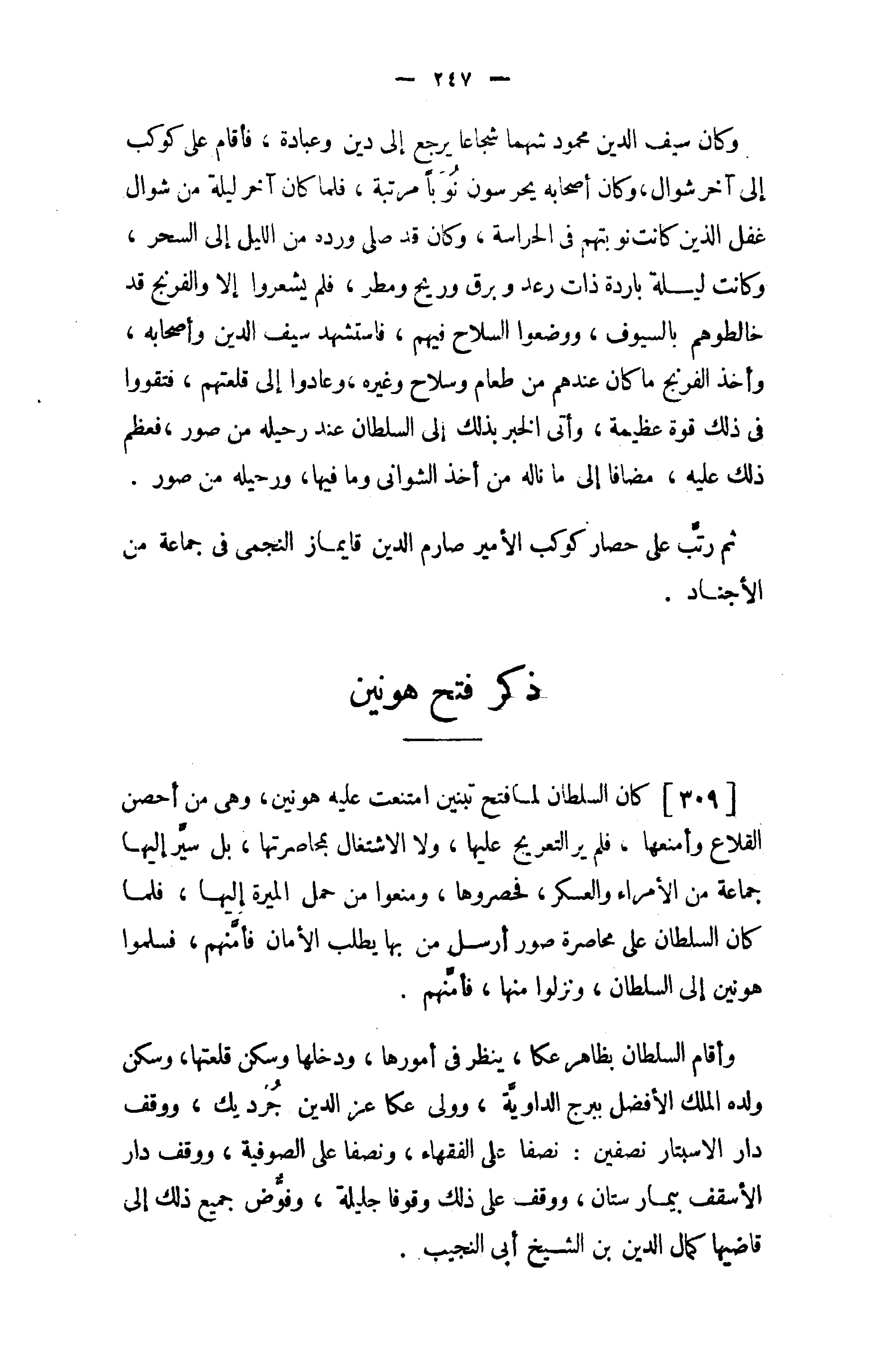 [309] كان السلطان لما فتح تبنين امتنعت عليه هونين، وهى من أحصن القلاع وأمنعها، فلم ير التعريج عليها، ولا الاشتغال بمحاصرتها، بل سيّر إليها جماعة من الأمراء والعسكر، فحصروها، ومنعوا من حمل الميرة إليها، فلما كان السلطان على محاصرة صور أرسل من بها يطلب الأمان فأمّنهم، فسلموا هونين إلى السلطان، ونزلوا منها، فأمّنهم.