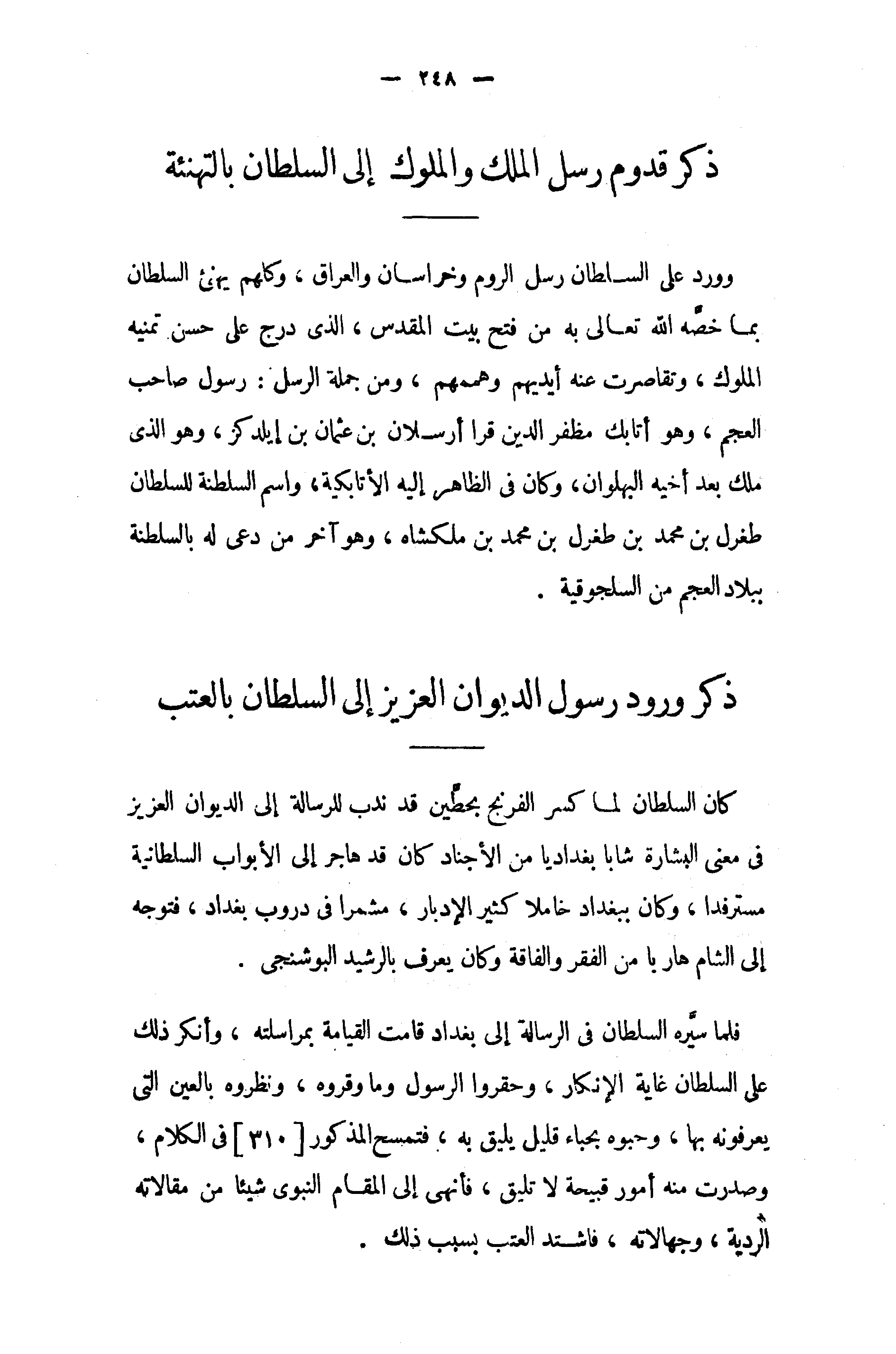 فلما سيّره السلطان في الرسالة إلى بغداد قامت القيامة بمراسلته، وأنكر ذلك على السلطان غاية الإنكار، وحقروا الرسول وما وقروه، ونظروه بالعين التي يعرفونه بها، وحبوه بحباء قليل يليق به، فتمسح المذكور [310] في الكلام، وصدرت منه أمور قبيحة لا تليق، فأنهى إلى المقام النبوى شيئا من مقالاته الردية، وجهالاته، فاشتد العتب بسبب ذلك.