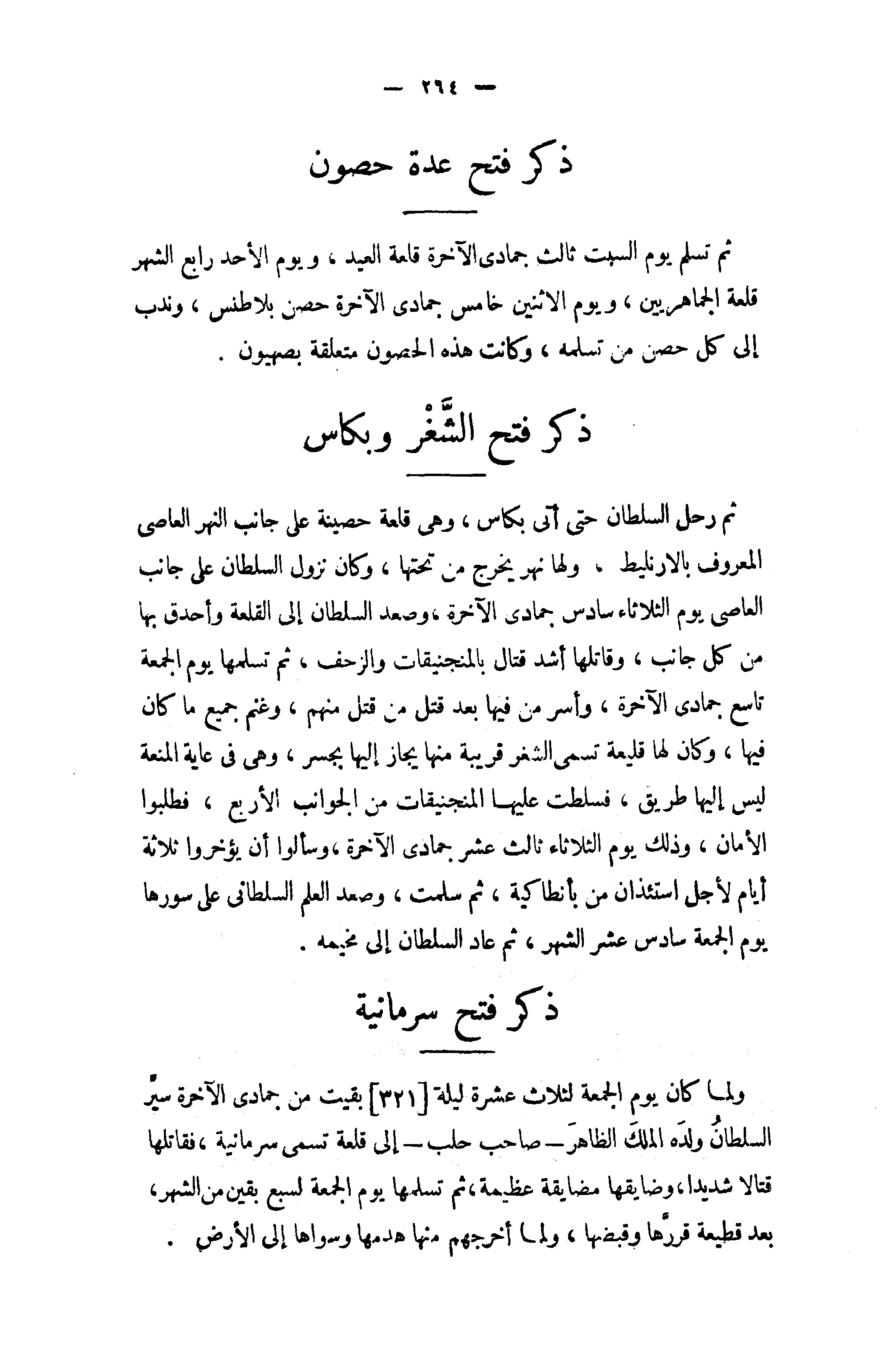 ولما كان يوم الجمعة لثلاث عشرة ليلة [321] بقيت من جمادى الآخرة سيّر السلطان ولده الملك الظاهر - صاحب حلب - إلى قلعة تسمى سرمانية، فقاتلها قتالا شديدا، وضايقها مضايقة عظيمة، ثم تسلمها يوم الجمعة لسبع بقين من الشهر، بعد قطيعة قررّها وقبضها، ولما أخرجهم منها هدمها وسواها إلى الأرض.