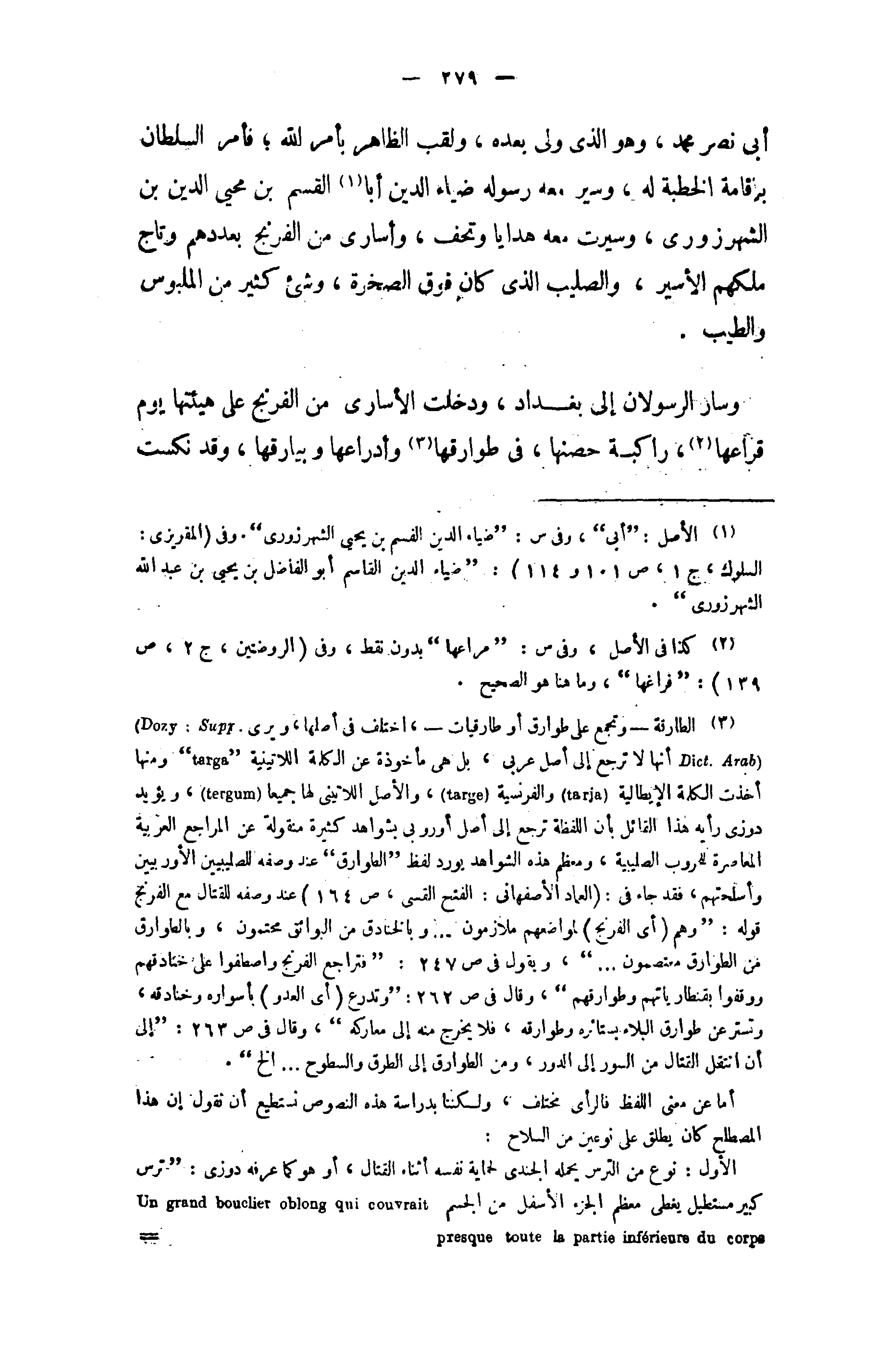 (¬3) الطارقة - وتجمع على طوارق أو طارقيات -، اختلف في أصلها، ويرى (Dozy : Supp Dict .Arab) أنها لا ترجع إلى أصل عربى، بل هى مأخوذة عن الكلمة اللاتينية " targa " ومنها أخذت الكلمة الإيطالية (tarja) والفرنسية، (targe) والأصل اللاتينى لها جميعا، (tergum) ويؤيد دوزى رأيه هذا القائل بأن اللفظة ترجع إلى أصل أوروبى بشواهد كثيرة منقولة عن المراجع العربية المعاصرة للحروب الصليبية، ومعظم هذه الشواهد يورد لفظ " الطوارق " عند وصفه للصليبيين الأوربيين وأسلحتهم، فقد جاء في: (العماد الأصفهانى: الفتح القسى، ص 164) عند وصفه للقتال مع الفرنج قوله: " وهم (أي الفرنج) لمواضعهم ملازمون. . . وبالخنادق من البوائق محتمون، وبالطوارق من الطوارق معتصمون. . . "، ويقول في ص 247: " فتراجع الفرنج واصطفوا على خنادقهم ووقفوا بقنطار يأتهم وطوارقهم "، وقال في ص 262: " وتدرع (أي العدو) بأسواره وخنادقه، وتستر عن طوارق البلاء بستائره وطوارقه، فلا يخرج منه إلى معاركه "، وقال في ص 263: " إلى أن انتقل القتال من السور إلى الدور، ومن الطوارق إلى الطرق والسطوح. . . الخ ". أما عن معنى اللفظ فالرأى مختلف، ولكننا بدراسة هذه النصوص نستطيع أن نقول إن هذا المصطلح كان يطلق على نوعين من السلاح: الأول: نوع من الترس يحمله الجندى لحماية نفسه أثناء القتال، أو هو كما عرفه دوزى: " ترس كبير مستطيل يغطى معظم الجزء الأسفل من الجسم