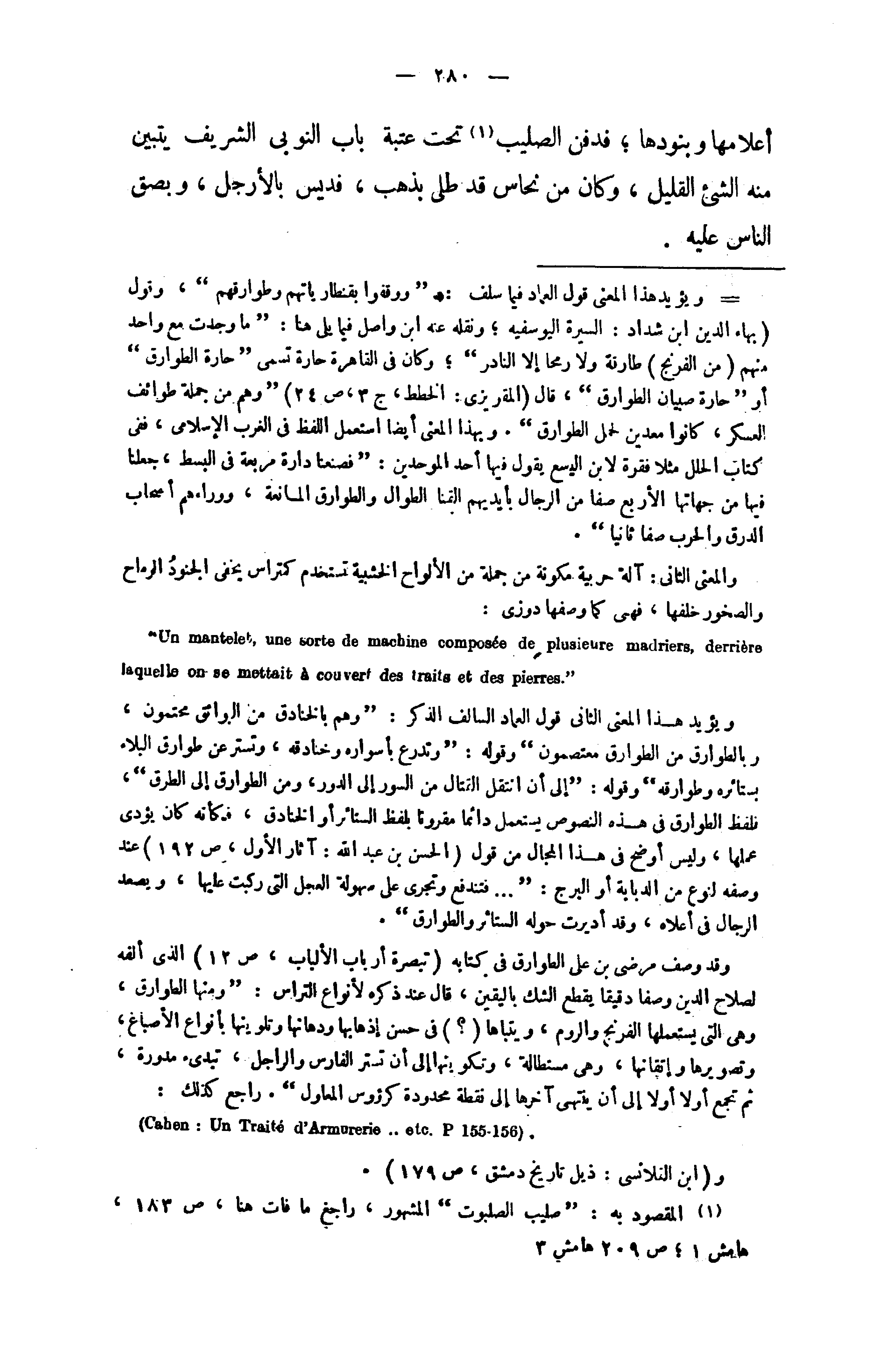 ويؤيد هذا المعنى الثانى قول العماد السالف الذكر: " وهم بالخنادق من البوائق محتمون، وبالطوارق من الطوارق معتصمون " وقوله: " وتدرع بأسواره وخنادقه، وتستر عن طوارق البلاء بستائره وطوارقه " وقوله: " إلى أن انتقل القتال من السور إلى الدور، ومن الطوارق إلى الطرق "، فلفظ الطوارق في هذه النصوص يستعمل دائما مقرونا بلفظ الستائر أو الخنادق، فكأنه كان يؤدى عملها، وليس أوضح في هذا المجال من قول (الحسن بن عبد الله: آثار الأول، ص 192) عند وصفه لنوع من الدبابة أو البرج: ". . . فتندفع وتجرى على سهولة العجل التي ركبت عليها، ويصعد الرجال في أعلاه، وقد أديرت حوله الستائر والطوارق ". وقد وصف مرضى بن على الطوارق في كتابه (تبصرة أرباب الألباب، ص 12) الذى ألفه لصلاح الدين وصفا دقيقا يقطع الشك باليقين، قال عند ذكره لأنواع التراس: " ومنها الطوارق، وهى التي يستعملها الفرنج والروم، ويتباها (؟) في حسن إذهابها ودهانها وتلوينها بأنواع الأصباغ، وتصويرها وإتقانها، وهى مستطالة، وتكوينها إلى أن تستر الفارس والراجل، تبدئ مدورة، ثم تجمع أولا أولا إلى أن ينتهى آخرها إلى نقطة محدودة كرؤوس المعاول ". راجع كذلك: