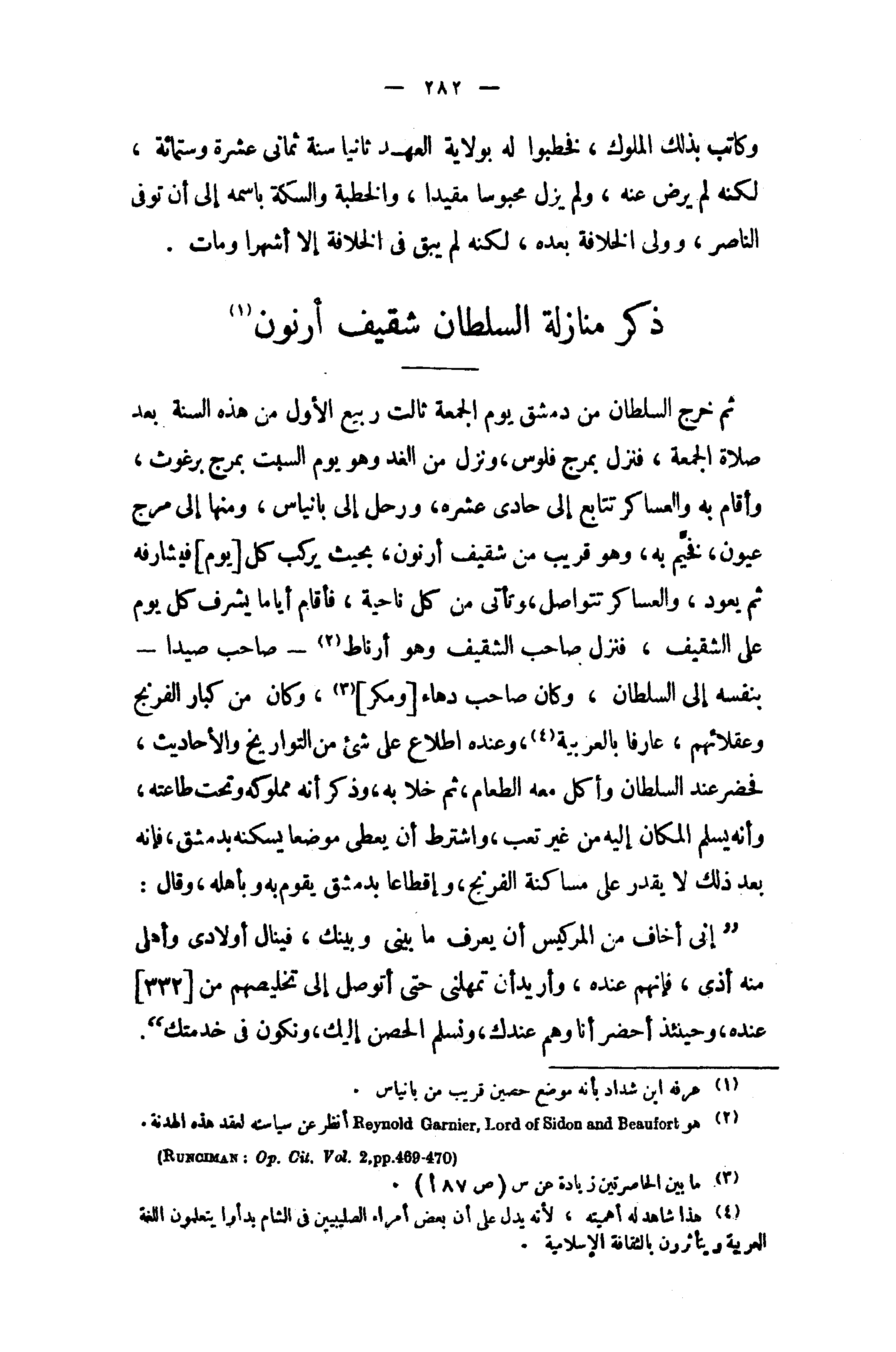 ثم خرج السلطان من دمشق يوم الجمعة ثالث ربيع الأول من هذه السنة بعد صلاة الجمعة، فنزل بمرج فلوس، ونزل من الغد وهو يوم السبت بمرج برغوث، وأقام به والعساكر تتابع إلى حادى عشره، ورحل إلى بانياس، ومنها إلى مرج عيون، فخيّم به، وهو قريب من شقيف أرنون، بحيث يركب كل [يوم] فيشارفه ثم يعود، والعساكر تتواصل، وتأتى من كل ناحية، فأقام أياما يشرف كل يوم على الشقيف، فنزل صاحب الشقيف وهو أرناط (¬2) - صاحب صيدا - بنفسه إلى السلطان، وكان صاحب دهاء [ومكر] (¬3)، وكان من كبار الفرنج وعقلائهم، عارفا بالعربية (¬4)، وعنده اطلاع على شئ من التواريخ والأحاديث، فحضر عند السلطان وأكل معه الطعام، ثم خلا به، وذكر أنه مملوكه وتحت طاعته، وأنه يسلم المكان إليه من غير تعب، واشترط أن يعطى موضعا يسكنه بدمشق، فإنه بعد ذلك لا يقدر على مساكنة الفرنج، وإقطاعا بدمشق يقوم به وبأهله، وقال: