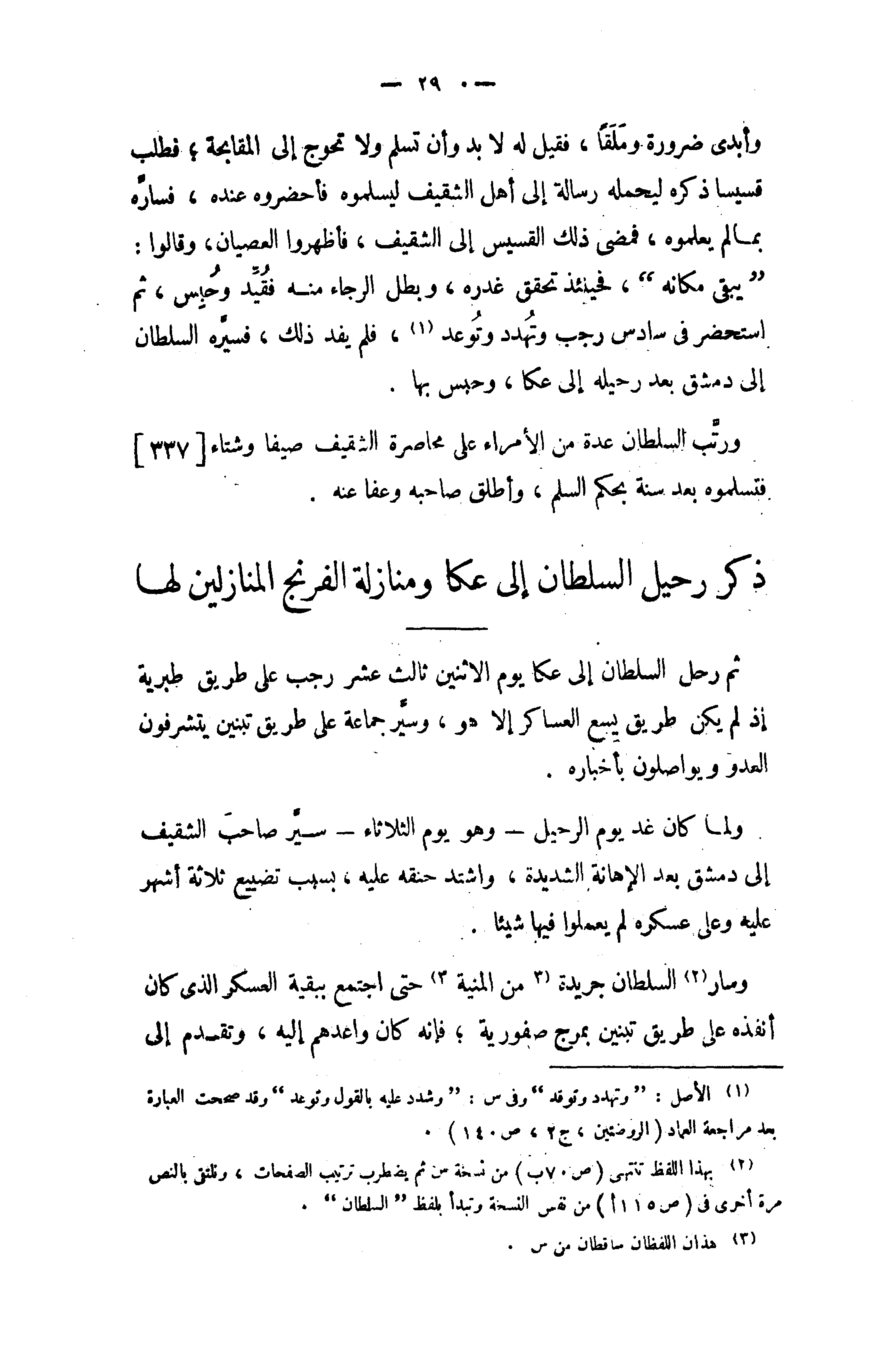 وسار (¬2) السلطان جريدة (3) من المنية (¬3) حتى اجتمع ببقية العسكر الذى كان أنفذه على طريق تبنين بمرج صفورية؛ فإنه كان واعدهم إليه، وتقدم إلى