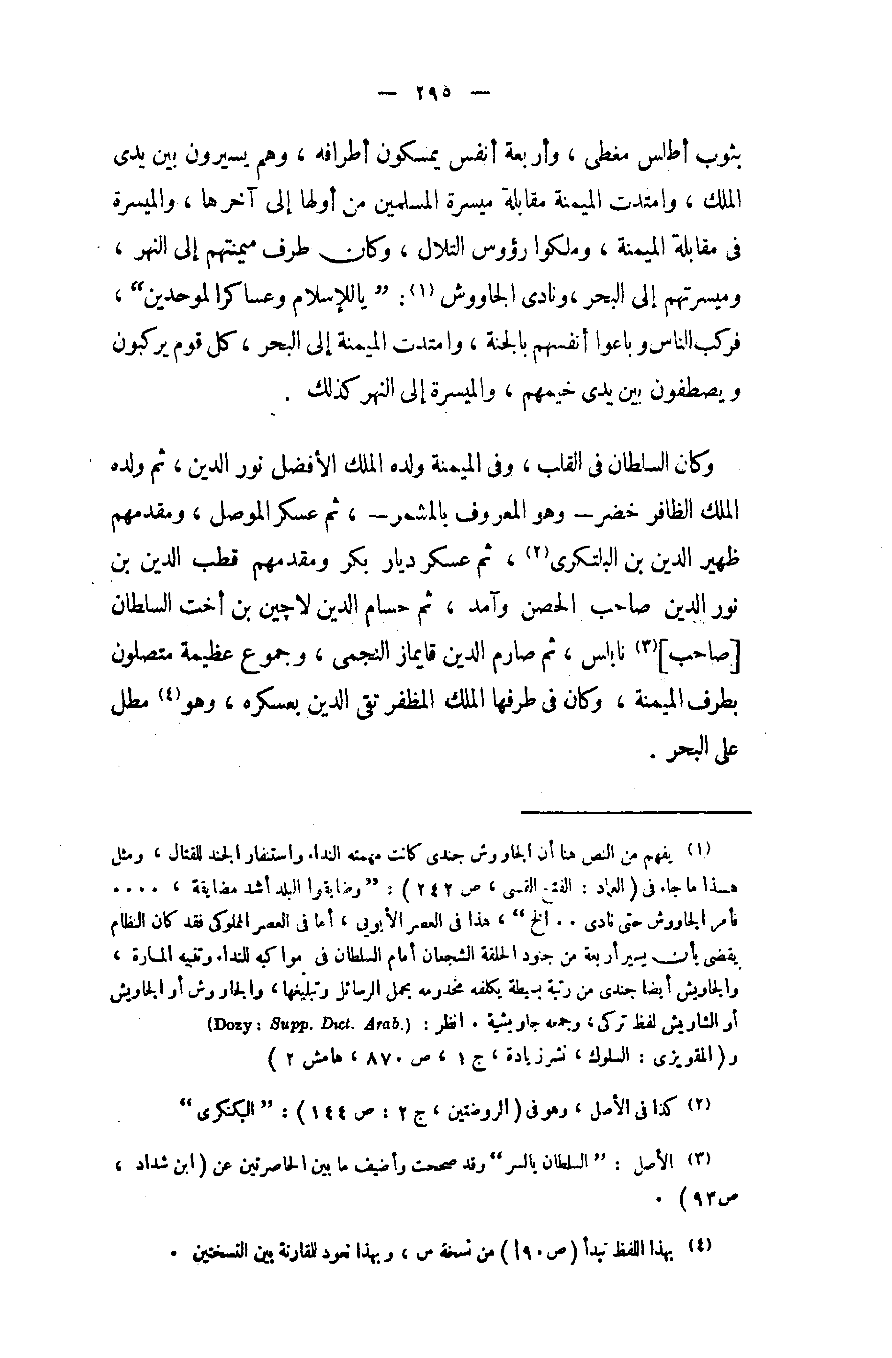 (¬1) يفهم من النص هنا أن الجاووش جندى كانت مهمته النداء واستنفار الجند للقتال، ومثل هذا ما جاء في (العماد: الفتح القسى، ص 242): " وضايقوا البلد أشد مضايقة،. . . . فأمر الجاووش حتى نادى. . . الخ "، هذا في العصر الأيوبى، أما في العصر المملوكى فقد كان النظام يقضى بأن يسير أربعة من جنود الحلقة الشجعان أمام السلطان في مواكبه للنداء وتنبيه المارة، والجاويش أيضا جندى من رتبة بسيطة يكلفه مخدومه بحمل الرسائل وتبليغها، والجاووش أو الجاويش أو الشاويش لفظ تركى، وجمعه جاويشية.