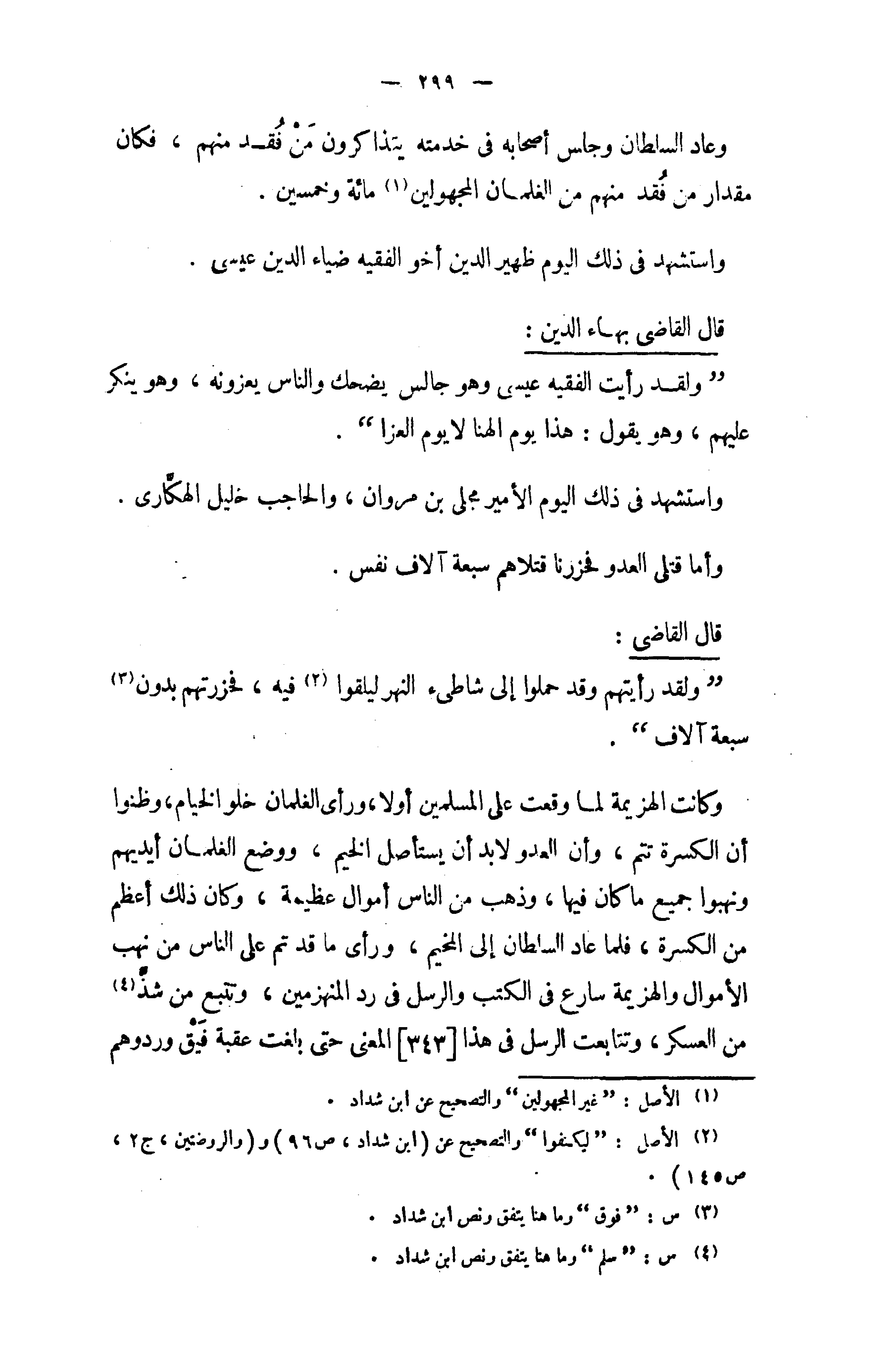 وكانت الهزيمة لما وقعت على المسلمين أولا، ورأى الغلمان خلو الخيام، وظنوا أن الكسرة تتم، وأن العدو لابد أن يستأصل الخيم، ووضع الغلمان أيديهم ونهبوا جميع ما كان فيها، وذهب من الناس أموال عظيمة، وكان ذلك أعظم من الكسرة، فلما عاد السلطان إلى المخيم، ورأى ما قد تم على الناس من نهب الأموال والهزيمة سارع في الكتب والرسل في رد المنهزمين، وتتبع من شذّ (¬4) من العسكر، وتتابعت الرسل في هذا [343] المعنى حتى بلغت عقبة فيق وردوهم