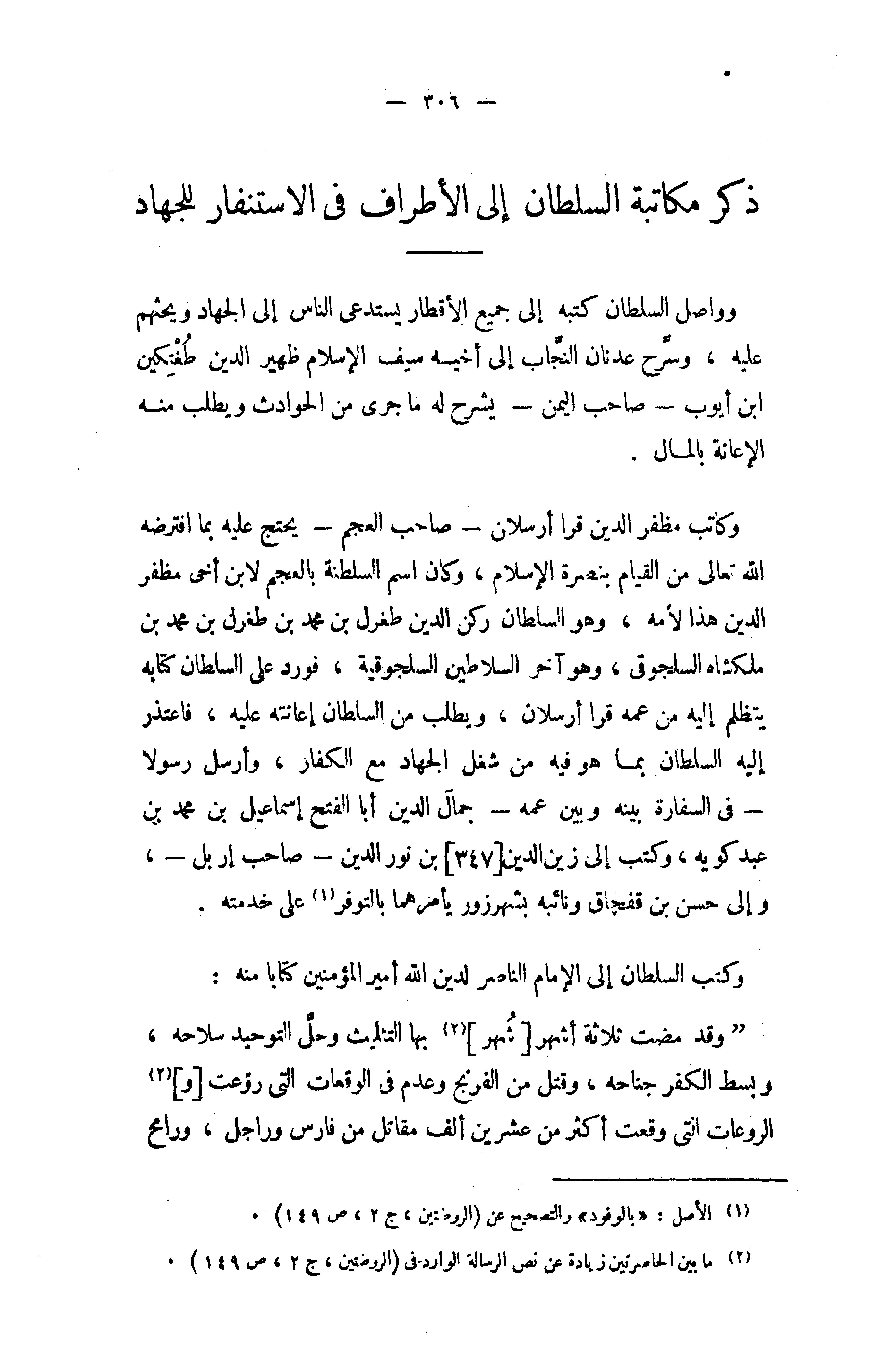 (¬2) ما بين الحاصرتين زيادة عن نص الرسالة الوارد في (الروضتين، ج 2، ص 149).