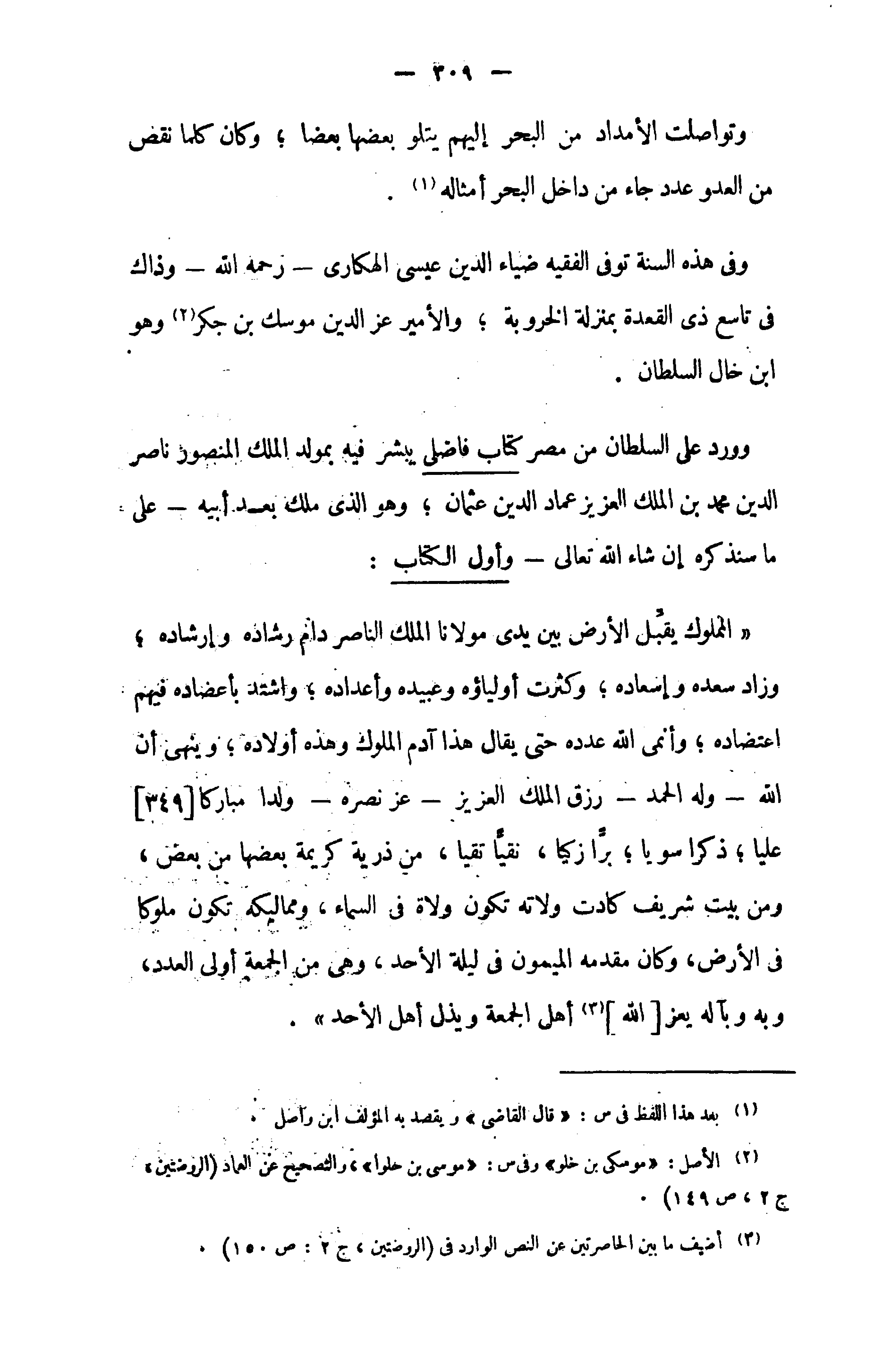 «المملوك يقّبل الأرض بين يدى مولانا الملك الناصر دام رشاده وإرشاده؛ وزاد سعده وإسعاده؛ وكثرت أولياؤه وعبيده وأعداده؛ واشتد بأعضاده فيهم اعتضاده؛ وأنمى الله عدده حتى يقال هذا آدم الملوك وهذه أولاده؛ وينهى أن الله - وله الحمد - رزق الملك العزيز - عز نصره - ولدا مباركا [349] عليا؛ ذكرا سويا؛ برّا زكيا، نقيّا تقيا، من ذرية كريمة بعضها من بعض، ومن بيت شريف كادت ولاته تكون ولاة في السماء، ومماليكه تكون ملوكا في الأرض، وكان مقدمه الميمون في ليلة الأحد، وهى من الجمعة أولى العدد، وبه وبآله يعز [الله] (¬3) أهل الجمعة ويذل أهل الأحد».