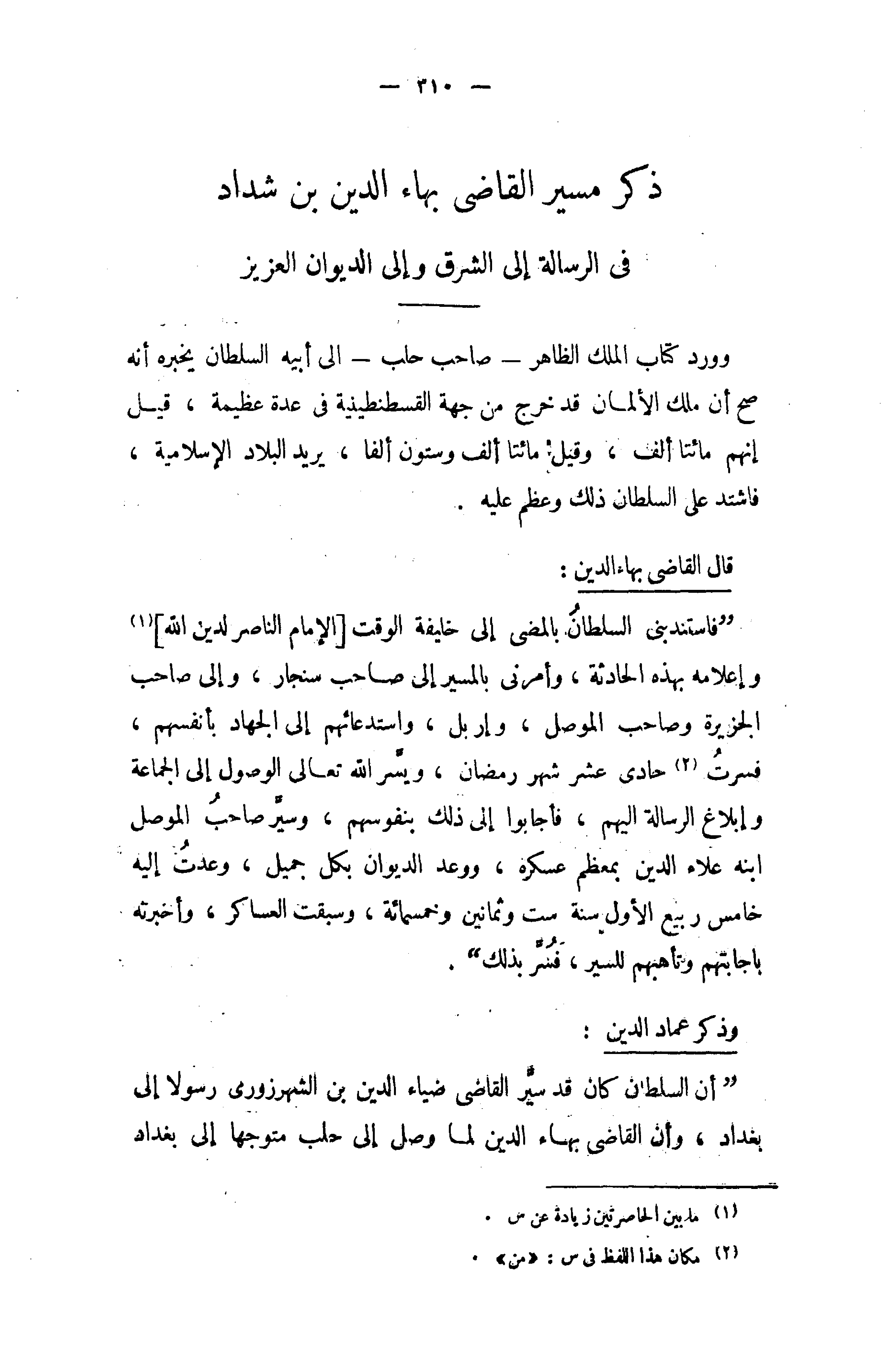 " أن السلطان كان قد سيّر القاضى ضياء الدين بن الشهرزورى رسولا إلى بغداد، وأن القاضى بهاء الدين لما وصل إلى حلب متوجها إلى بغداد