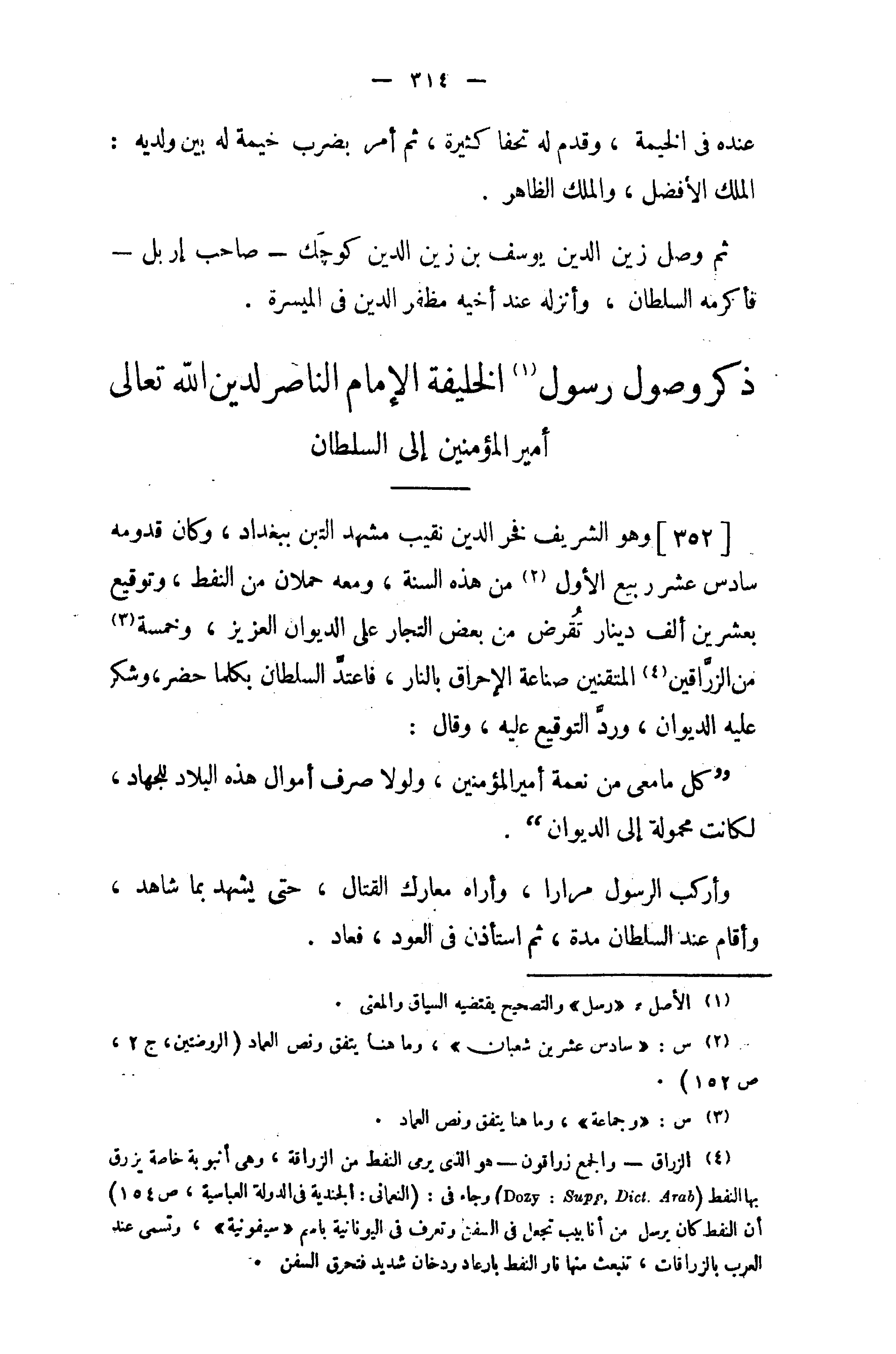 [352] وهو الشريف فخر الدين نقيب مشهد التبن ببغداد، وكان قدومه سادس عشر ربيع الأول (¬2) من هذه السنة، ومعه حملان من النفط، وتوقيع بعشرين ألف دينار تقرض من بعض التجار على الديوان العزيز، وخمسة (¬3) من الزرّاقين (¬4) المتقنين صناعة الإحراق بالنار، فاعتدّ السلطان بكلما حضر، وشكر عليه الديوان، وردّ التوقيع عليه، وقال: