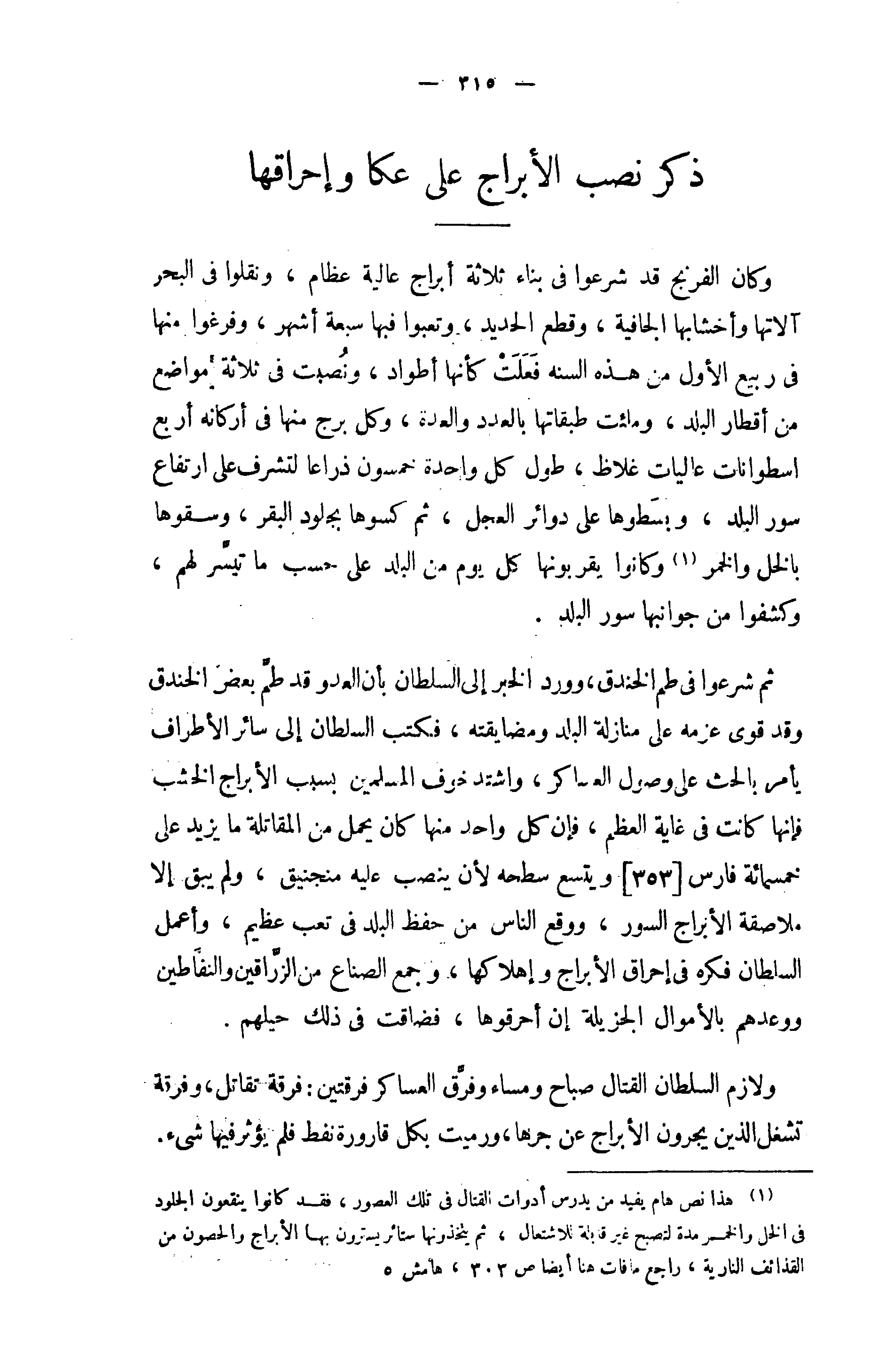 (¬1) هذا نص هام يفيد من يدرس أدوات القتال في تلك العصور، فقد كانوا ينقعون الجلود في الخل والخمر مدة لتصبح غير قابلة للاشتعال، ثم يتخذونها ستائر يسترون بها الأبراج والحصون من القذائف النارية، راجع ما فات هنا أيضا ص 303، هامش 5.