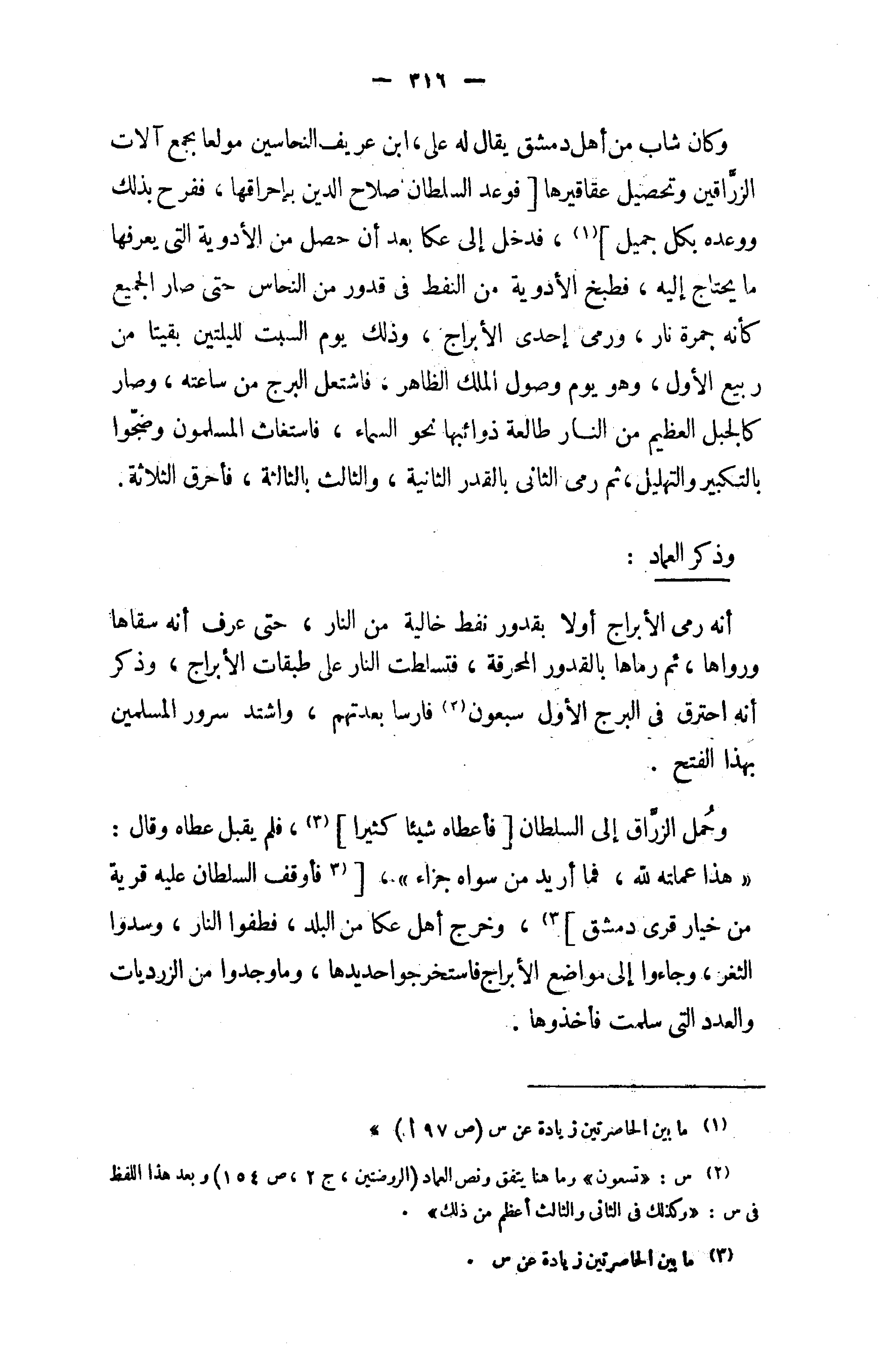 وكان شاب من أهل دمشق يقال له على، ابن عريف النحاسين مولعا بجمع آلات الزرّاقين وتحصيل عقاقيرها [فوعد السلطان صلاح الدين بإحراقها، ففرح بذلك ووعده بكل جميل] (¬1)، فدخل إلى عكا بعد أن حصل من الأدوية التي يعرفها ما يحتاج إليه، فطبخ الأدوية من النفط في قدور من النحاس حتى صار الجميع كأنه جمرة نار، ورمى إحدى الأبراج، وذلك يوم السبت لليلتين بقيتا من ربيع الأول، وهو يوم وصول الملك الظاهر، فاشتعل البرج من ساعته، وصار كالجبل العظيم من النار طالعة ذوائبها نحو السماء، فاستغاث المسلمون وضجّوا بالتكبير والتهليل، ثم رمى الثانى بالقدر الثانية، والثالث بالثالثة، فأحرق الثلاثة.
