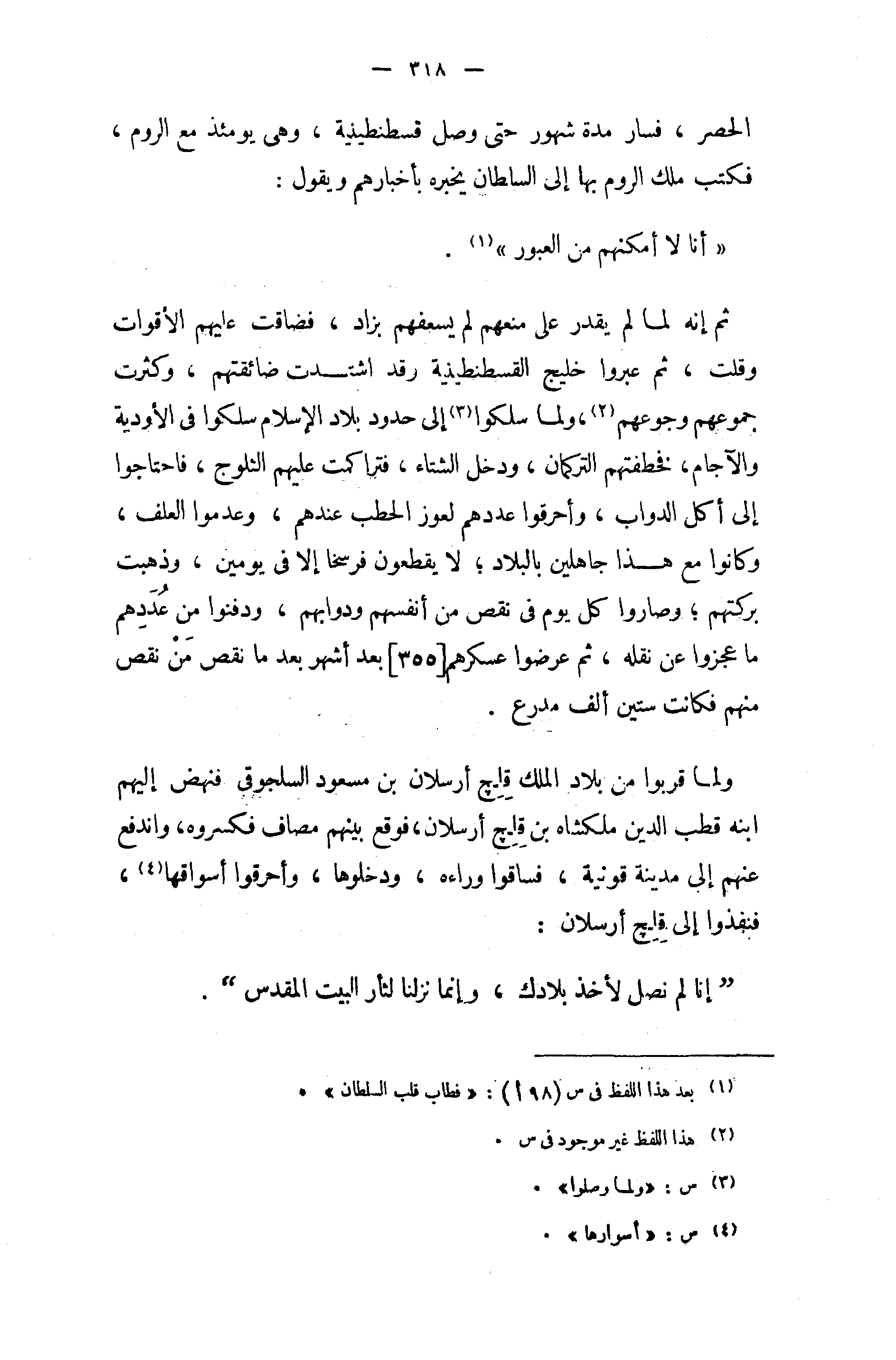 الحصر، فسار مدة شهور حتى وصل قسطنطينية، وهى يومئذ مع الروم، فكتب ملك الروم بها إلى السلطان يخبره بأخبارهم ويقول: