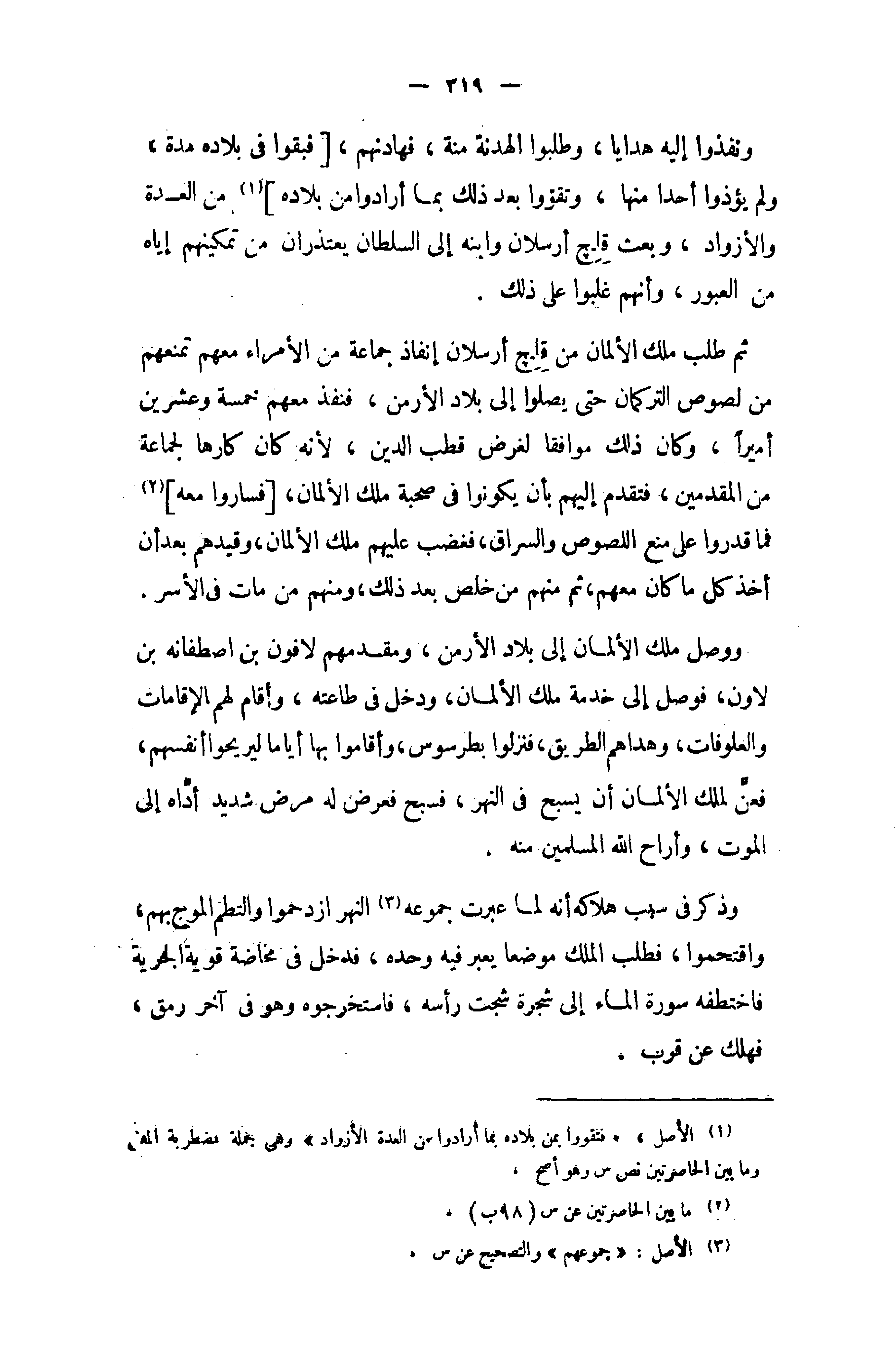 ثم طلب ملك الألمان من قلج أرسلان إنفاذ جماعة من الأمراء معهم تمنعهم من لصوص التركمان حتى يصلوا إلى بلاد الأرمن، فنفذ معهم خمسة وعشرين أميرا، وكان ذلك موافقا لغرض قطب الدين، لأنه كان كارها لجماعة من المقدمين، فتقدم إليهم بأن يكونوا في صحبة ملك الألمان، [فساروا معه] (¬2) فما قدروا على منع اللصوص والسراق، فغضب عليهم ملك الألمان، وقيدهم بعد أن أخذ كل ما كان معهم، ثم منهم من خلص بعد ذلك، ومنهم من مات في الأسر.