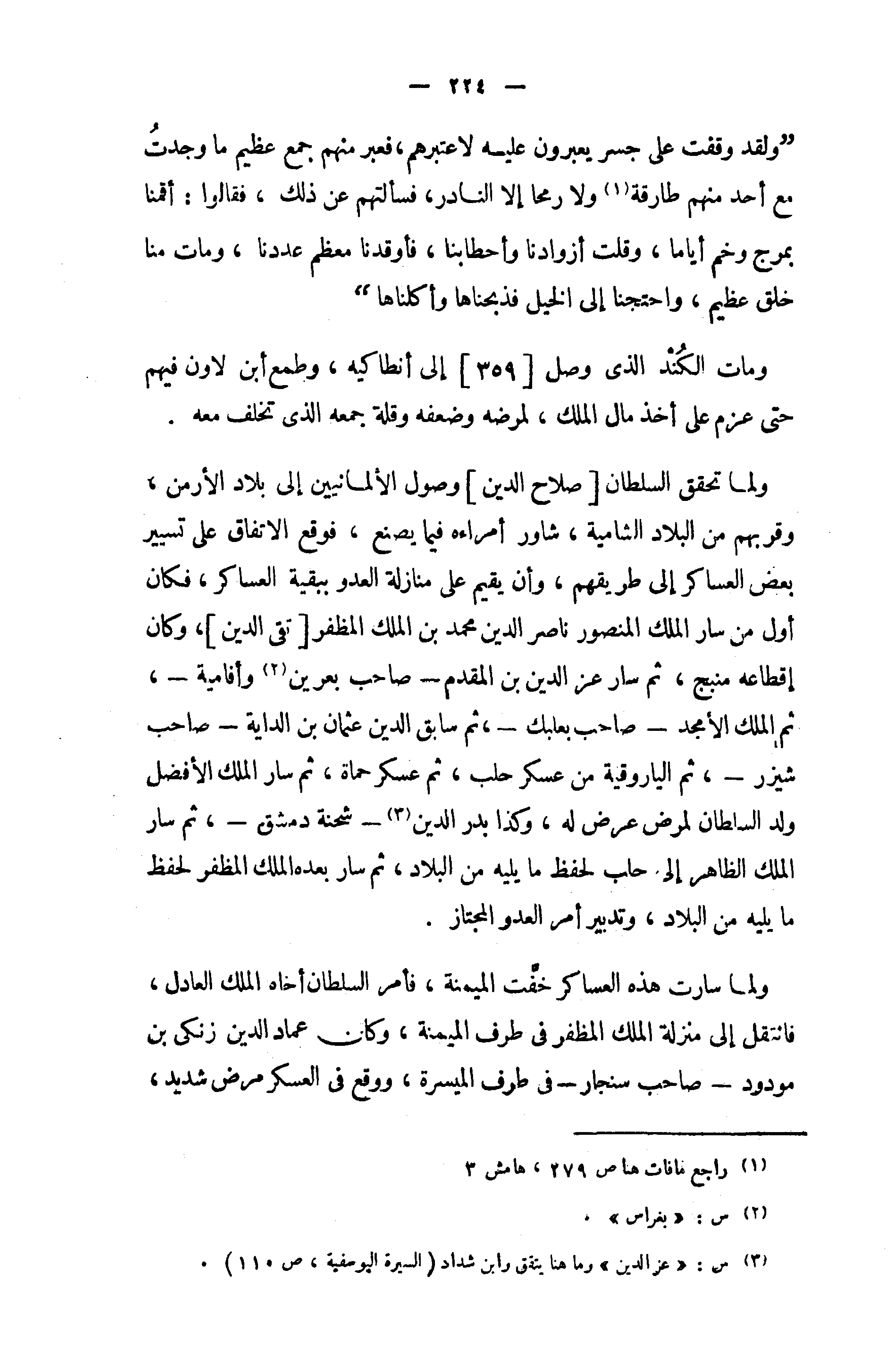 " ولقد وقفت على جسر يعبرون عليه لا عتبرهم، فعبر منهم جمع عظيم ما وجدت مع أحد منهم طارقة (¬1) ولا رمحا إلا النادر، فسألتهم عن ذلك، فقالوا: أقمنا بمرج وخم أياما، وقلت أزوادنا وأحطابنا، فأوقدنا معظم عددنا، ومات منا خلق عظيم، واحتجنا إلى الخيل فذبحناها وأكلناها "