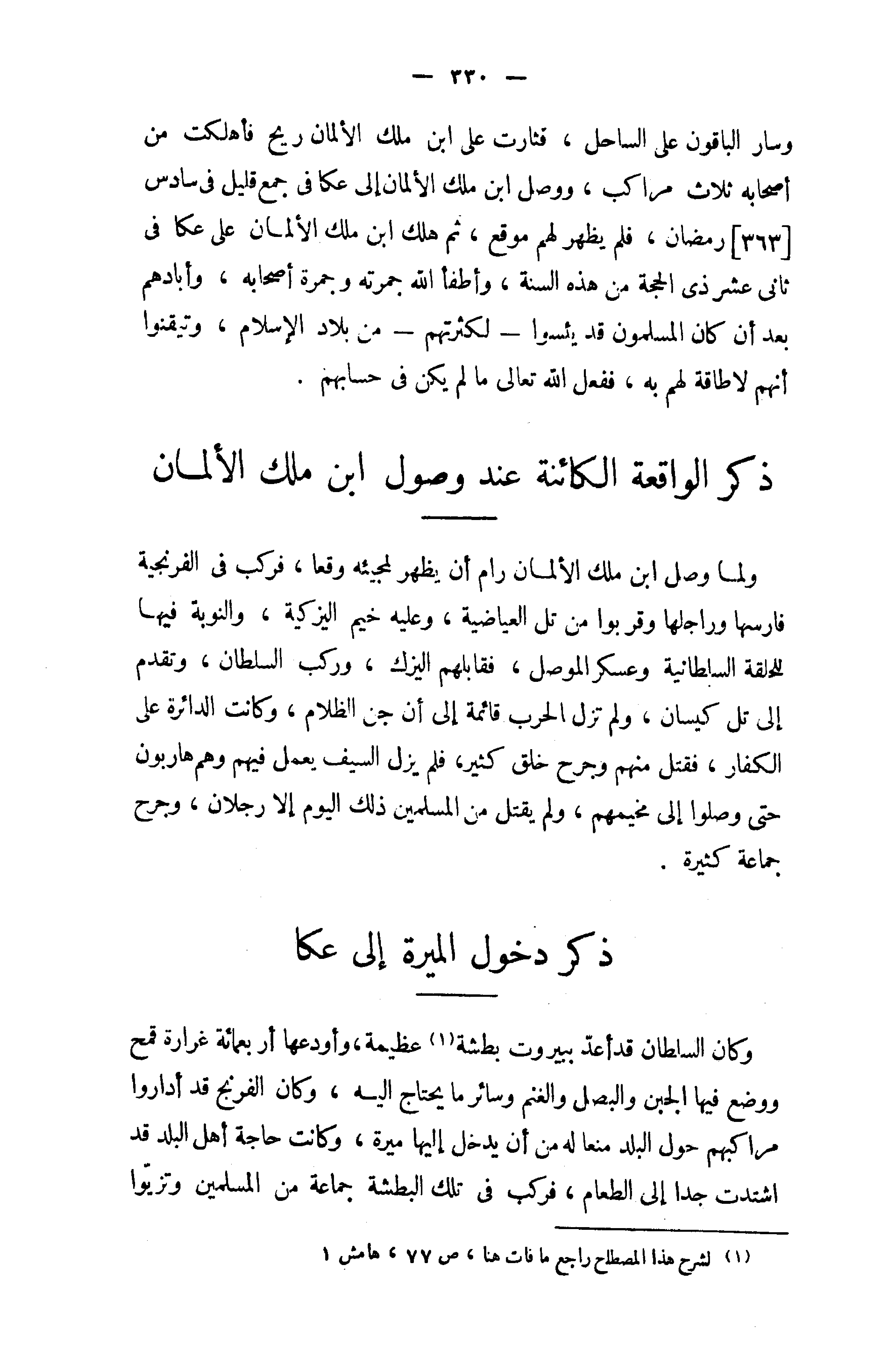 وسار الباقون على الساحل، فثارت على ابن ملك الألمان ريح فأهلكت من أصحابه ثلاث مراكب، ووصل ابن ملك الألمان إلى عكا في جمع قليل في سادس [363] رمضان، فلم يظهر لهم موقع، ثم هلك ابن ملك الألمان على عكا في ثانى عشر ذى الحجة من هذه السنة، وأطفأ الله جمرته وجمرة أصحابه، وأبادهم بعد أن كان المسلمون قد يئسوا - لكثرتهم - من بلاد الإسلام، وتيقنوا أنهم لا طاقة لهم به، ففعل الله تعالى ما لم يكن في حسابهم.