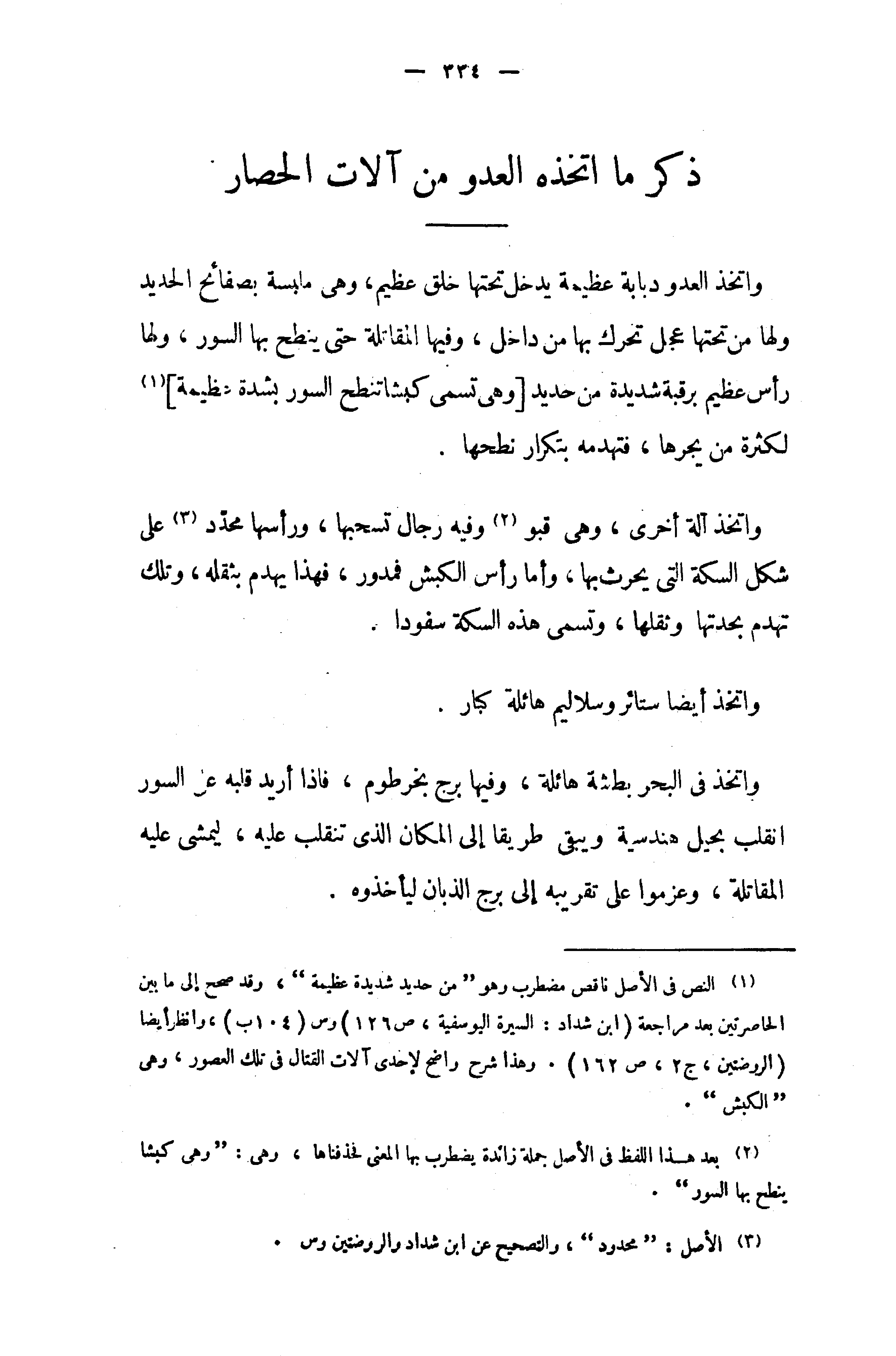 (¬1) النص في الأصل ناقص مضطرب وهو " من حديد شديدة عظيمة "، وقد صحح إلى ما بين الحاصرتين بعد مراجعة (ابن شداد: السيرة اليوسفية، ص 126) وس (104 ب)، وانظر أيضا (الروضتين، ج 2، ص 162). وهذا شرح واضح لإحدى آلات القتال في تلك العصور، وهى " الكبش ".