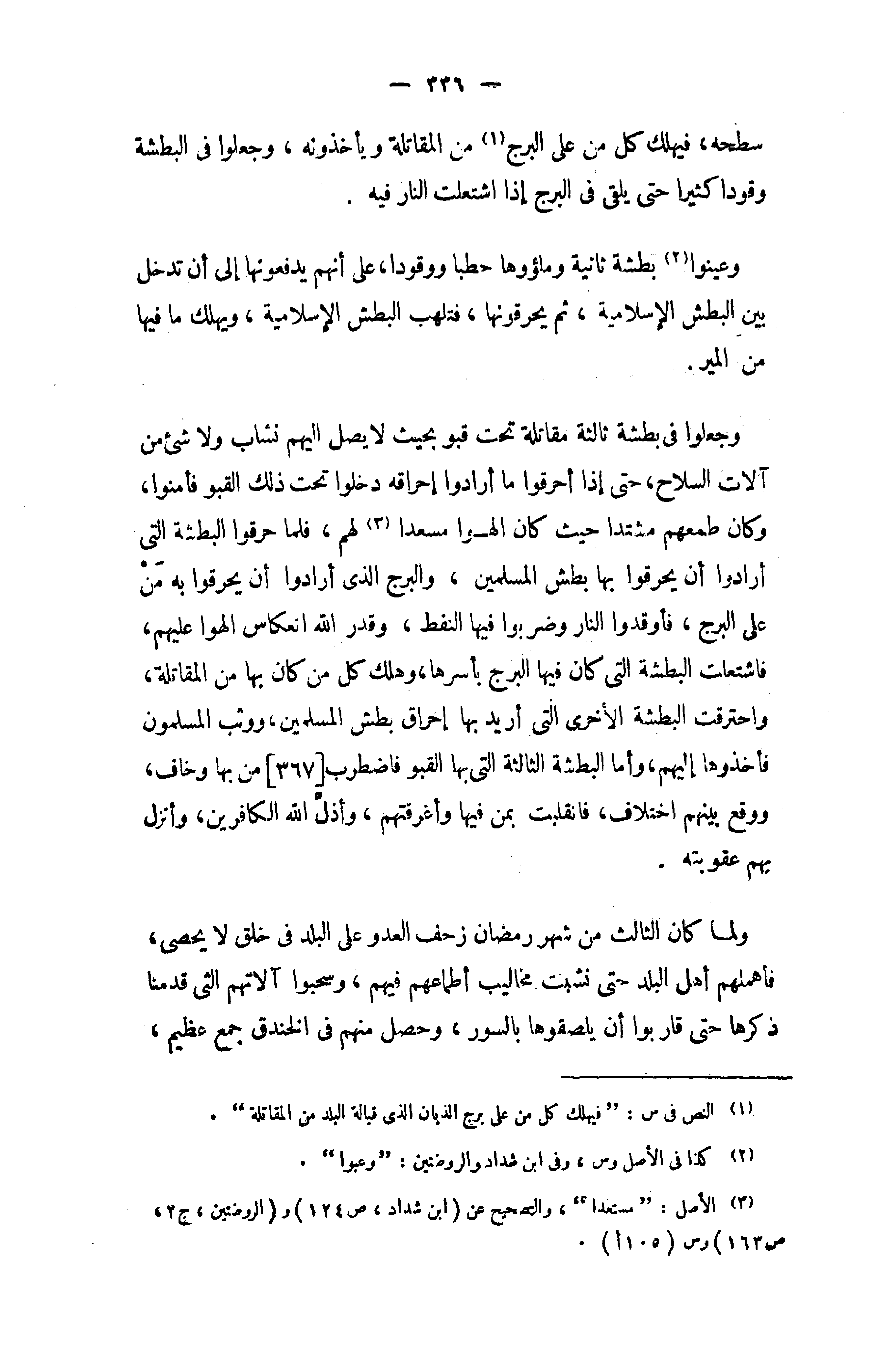 وجعلوا في بطشة ثالثة مقاتلة تحت قبو بحيث لا يصل اليهم نشاب ولا شئ من آلات السلاح، حتى إذا أحرقوا ما أرادوا إحراقه دخلوا تحت ذلك القبو فأمنوا، وكان طمعهم مشتدا حيث كان الهوا مسعدا (¬3) لهم، فلما حرقوا البطشة التي أرادوا أن يحرقوا بها بطش المسلمين، والبرج الذى أرادوا أن يحرقوا به من على البرج، فأوقدوا النار وضربوا فيها النفط، وقدر الله انعكاس الهوا عليهم، فاشتعلت البطشة التي كان فيها البرج بأسرها، وهلك كل من كان بها من المقاتلة، واحترقت البطشة الأخرى التي أريد بها إحراق بطش المسلمين، ووثب المسلمون فأخذوها إليهم، وأما البطشة الثالثة التي بها القبو فاضطرب [367] من بها وخاف، ووقع بينهم اختلاف، فانقلبت بمن فيها وأغرقتهم، وأذلّ الله الكافرين، وأنزل بهم عقوبته.