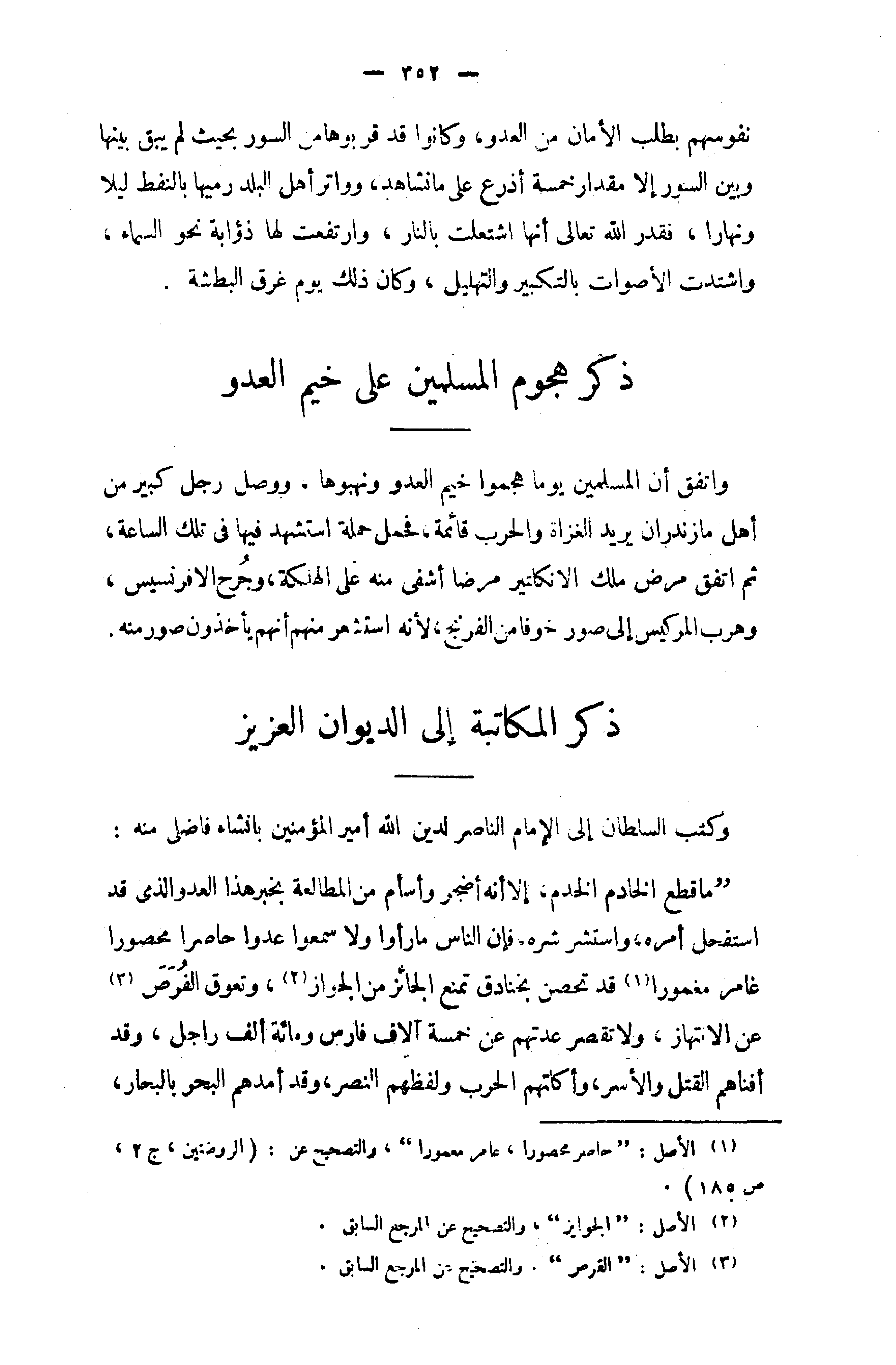 " ما قطع الخادم الخدم، إلا أنه أضجر وأسأم من المطالعة بخبر هذا العدو الذى قد استفحل أمره، واستشر شره فإن الناس ما رأوا ولا سمعوا عدوا حاصرا محصورا غامر مغمورا (¬1) قد تحصن بخنادق تمنع الجائز من الجواز (¬2)، وتعوق الفرص (¬3) عن الانتهاز، ولا تقصر عدتهم عن خمسة آلاف فارس ومائة ألف راجل، وقد أفناهم القتل والأسر، وأكلتهم الحرب ولفظهم النصر، وقد أمدهم البحر بالبحار،