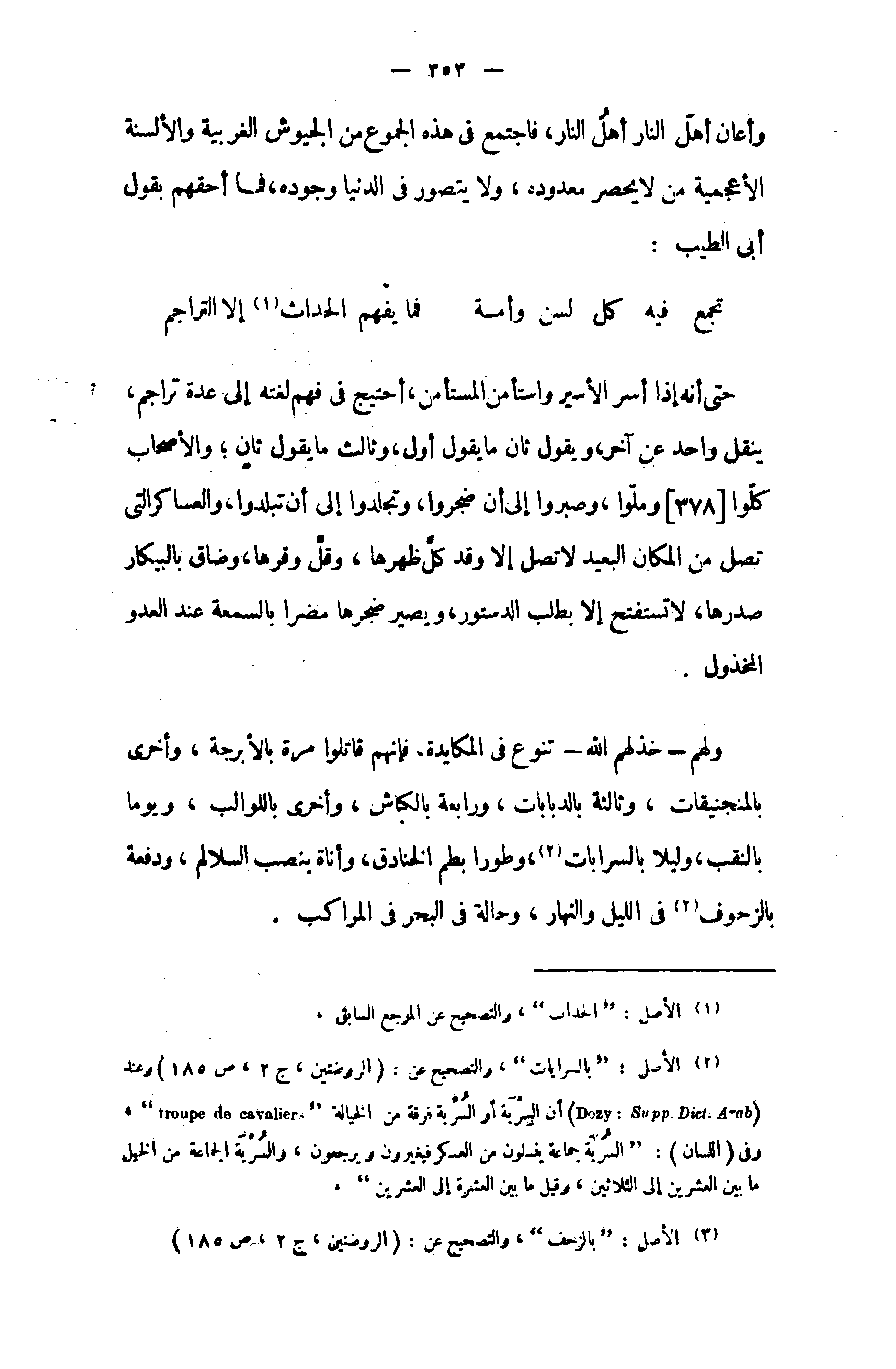 (¬2) الأصل: " بالسرايات "، والتصحيح عن: (الروضتين، ج 2، ص 185) وعند (Dozy : Supp .Dict .Arab) أن السربة أو السربة فرقة من الخيالة، " troupe de cavalier " وفى (اللسان): " السربة جماعة ينسلون من العسكر فيغيرون ويرجعون، والسربة الجماعة من الخيل ما بين العشرين إلى الثلاثين، وقيل ما بين العشرة إلى العشرين ".